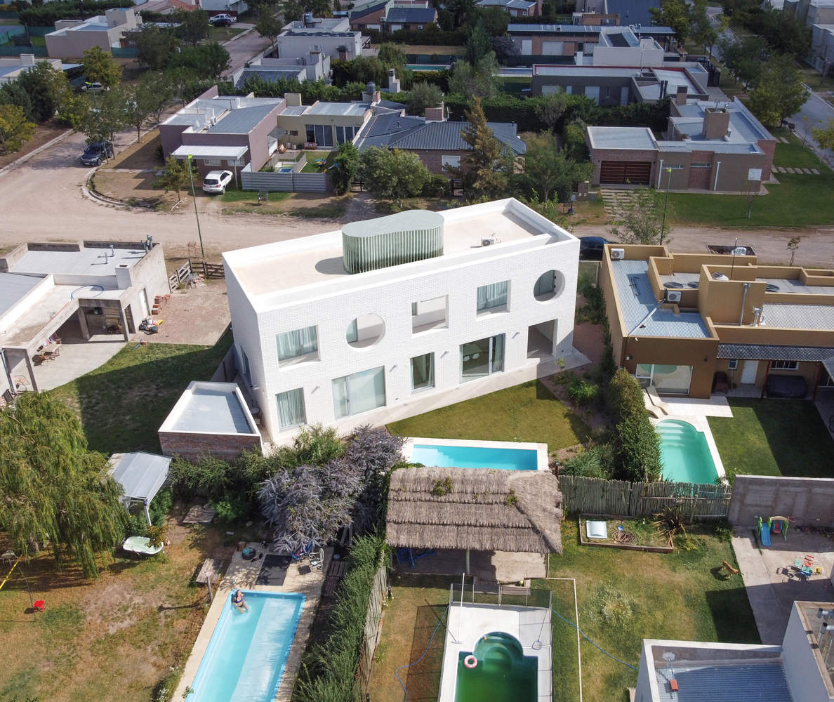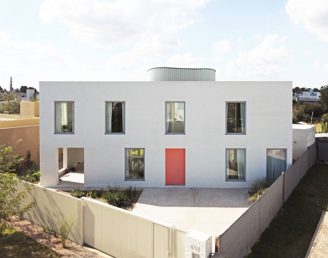 In terms of materials, the house presents itself as a solid block of exposed bricks, with façades composed of double walls with their respective air chambers and 50mm thick expanded polyurethane thermal insulation. This building has been designed to protect its interiors from the extreme climatic conditions characteristic of the city of Bahía Blanca during the winter and summer months.