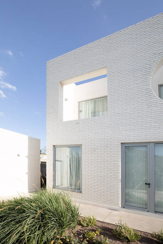 在材料方面,这座房子呈现为一块裸露的实心砖,立面由双墙组成,带有各自的气室和50mm厚的膨胀聚氨酯隔热层。这座建筑的设计是为了保护其内部免受冬季和夏季巴哈布兰卡市特有的极端气候条件的影响。