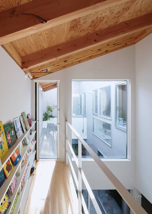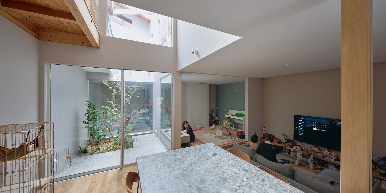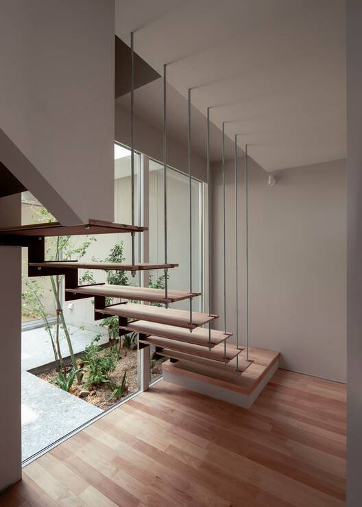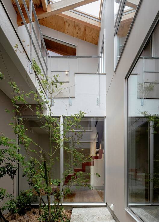 创建了一个庭院,使生活空间围绕庭院旋转。房间的布置是为了让太阳的运动在早上照亮学习区和卫生间,在下午照亮客厅。