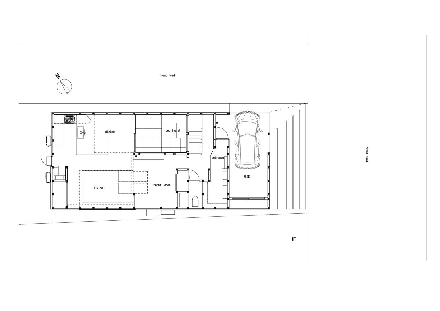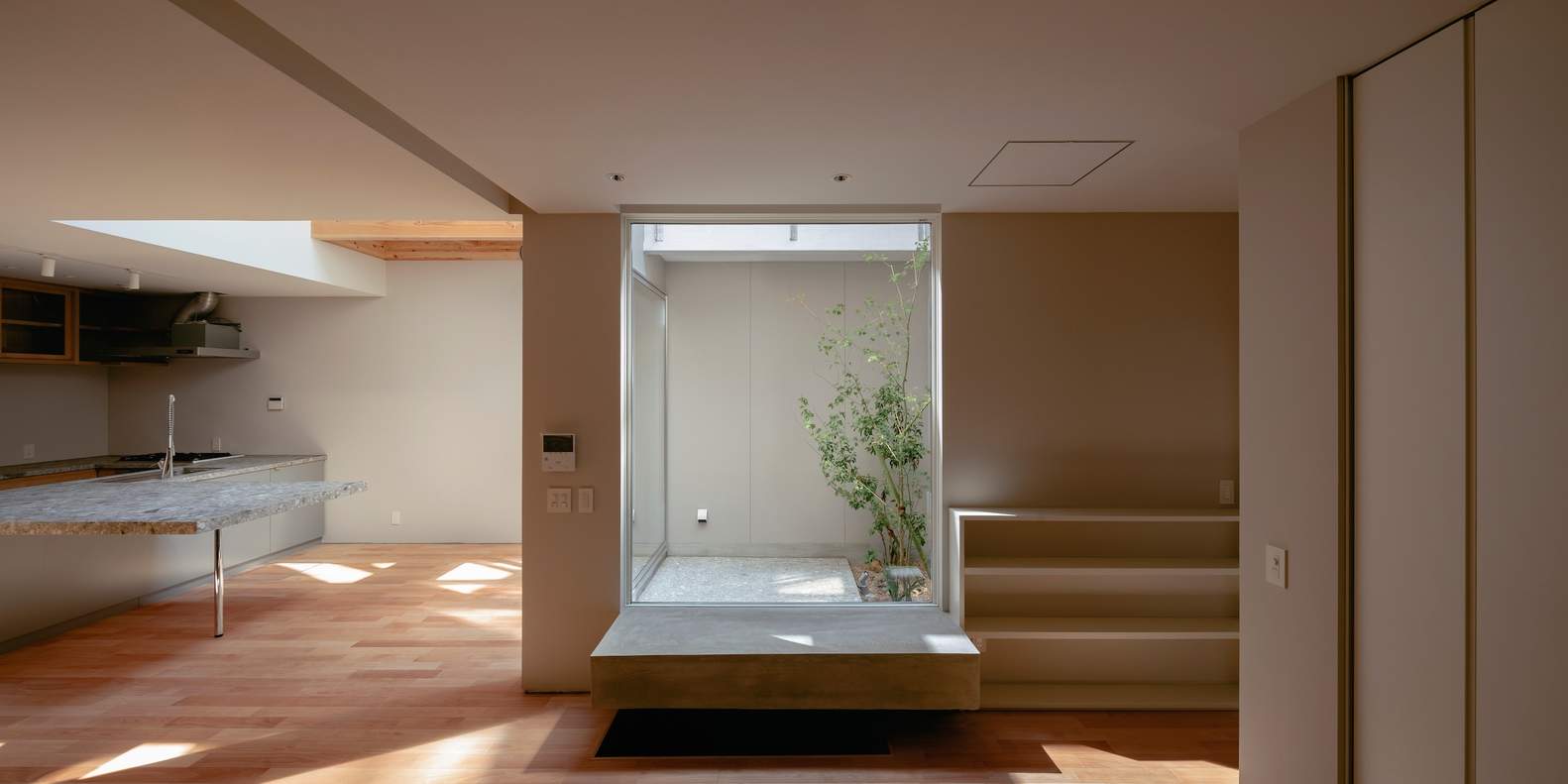 By creating a level below the floor, we have created a space where you can bury yourself in the earth and relax. The base extends and forms a table. The stairs were raised with bolts to create a floating staircase in front of the garden. The roof is structured to form a courtyard, and Mt. Fuji can be seen through the gap between the two intersecting roofs.