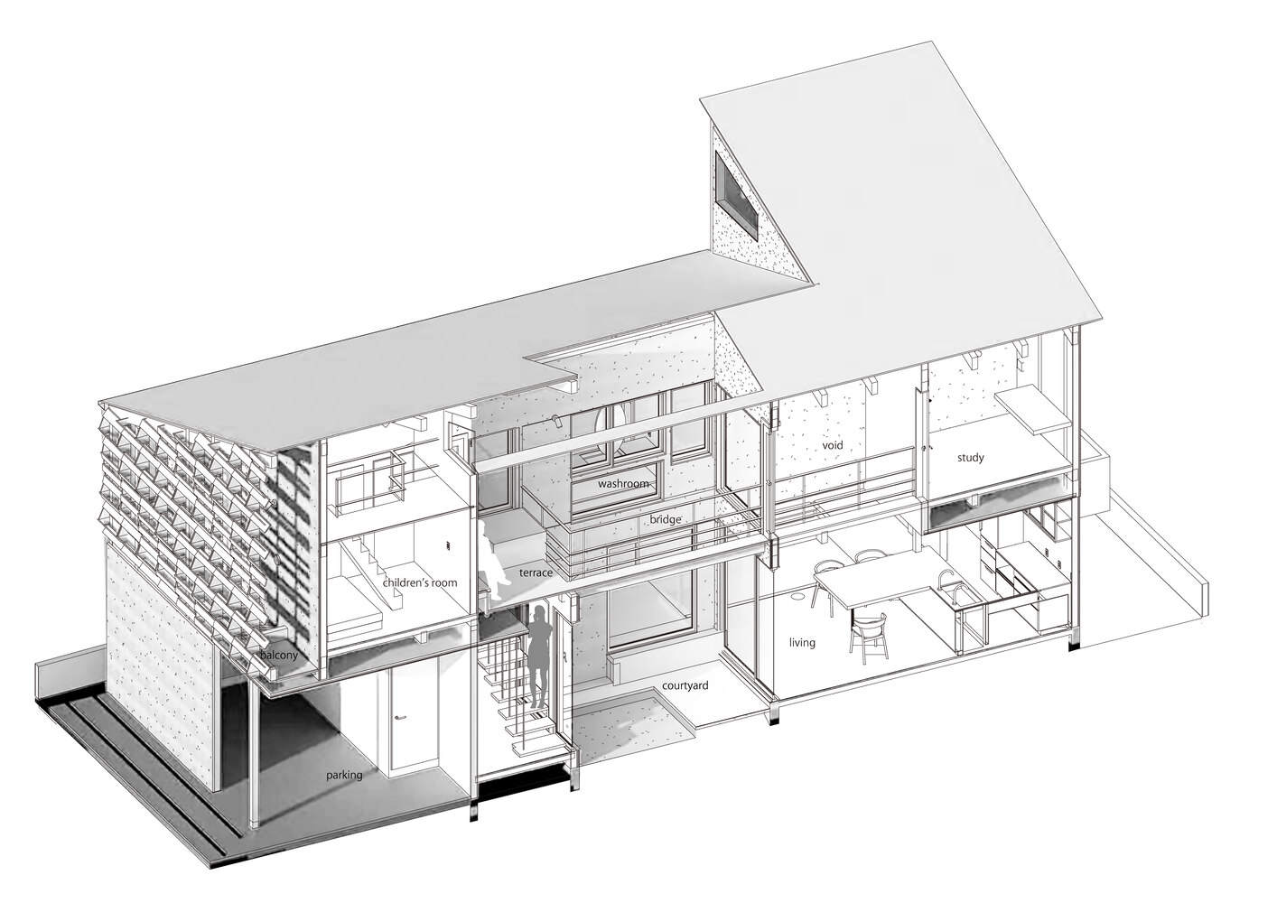 A courtyard was created so that the living space revolves around the courtyard. The rooms were arranged so that the movement of the sun would brighten the study area and washroom in the morning, and the living room in the afternoon.