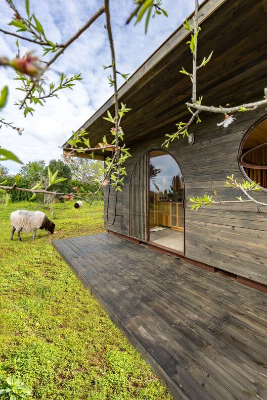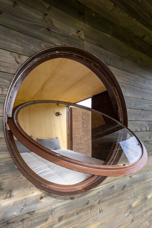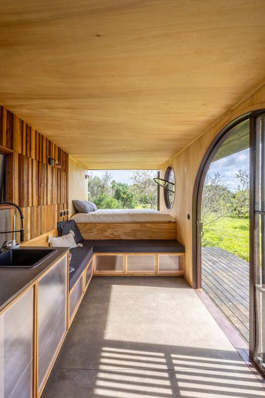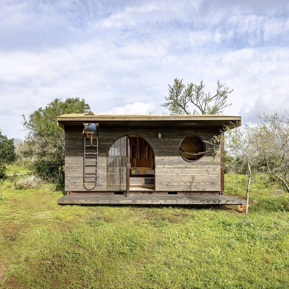 Text description provided by the architects. We undertook the challenge of transforming an old 6 x 2.5 m cargo container into a tiny house to be placed in the Algarve region in the south of Portugal. The project includes a small front porch, an arched doorway, and a porthole window framing the sunset. There is a rooftop terrace accessible via a metal ladder that goes through the exterior ceiling, providing additional outdoor space to enjoy the scenic views.