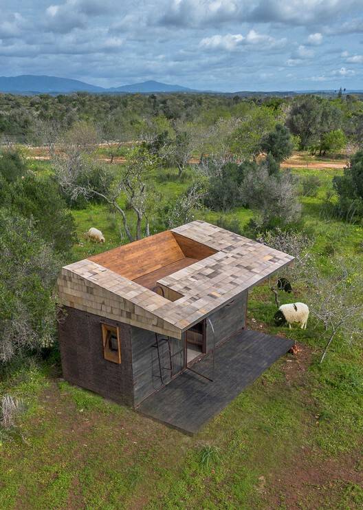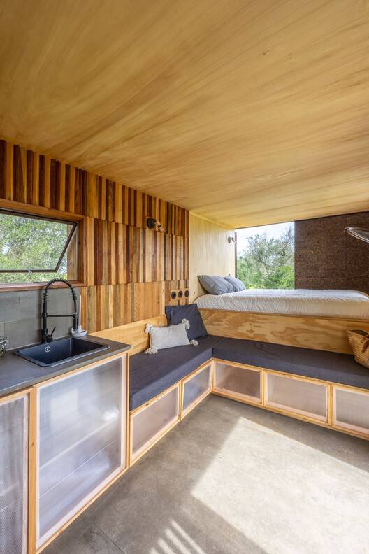 To integrate the structure with its natural surroundings, cork panels were chosen for the exterior walls to provide insulation and blend with the landscape. Inside, the space features poplar wood panels on the interior walls and concrete floors.