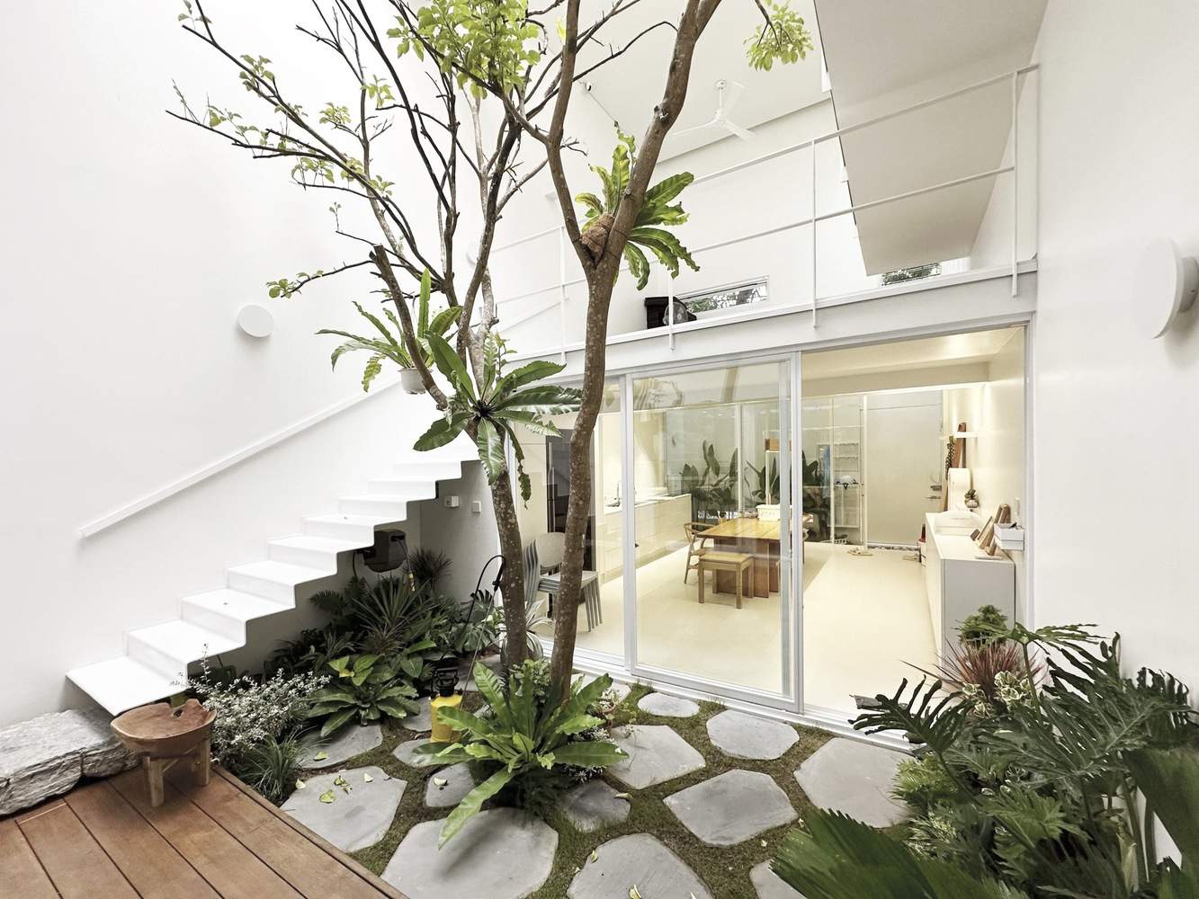 Green Connection (Om Cay) - space - green - space: Creative space conditions for indoor green space to develop tiered connecting spaces living in the house. All activities are around green trees to make the home space warm and create comfortability. The textures and rhythm in the connected designs create flexibility and lighting for the sleeping space and guests. Especially, in front of the house is a mango tree, so it is green and from the inside to the outside of the house, there are more spaces mixed with white colors and a simple monolithic design that highlights the connection between space and green trees in the house.