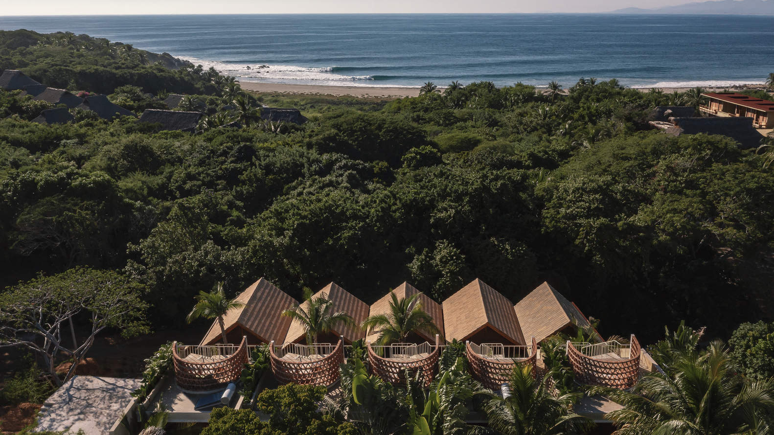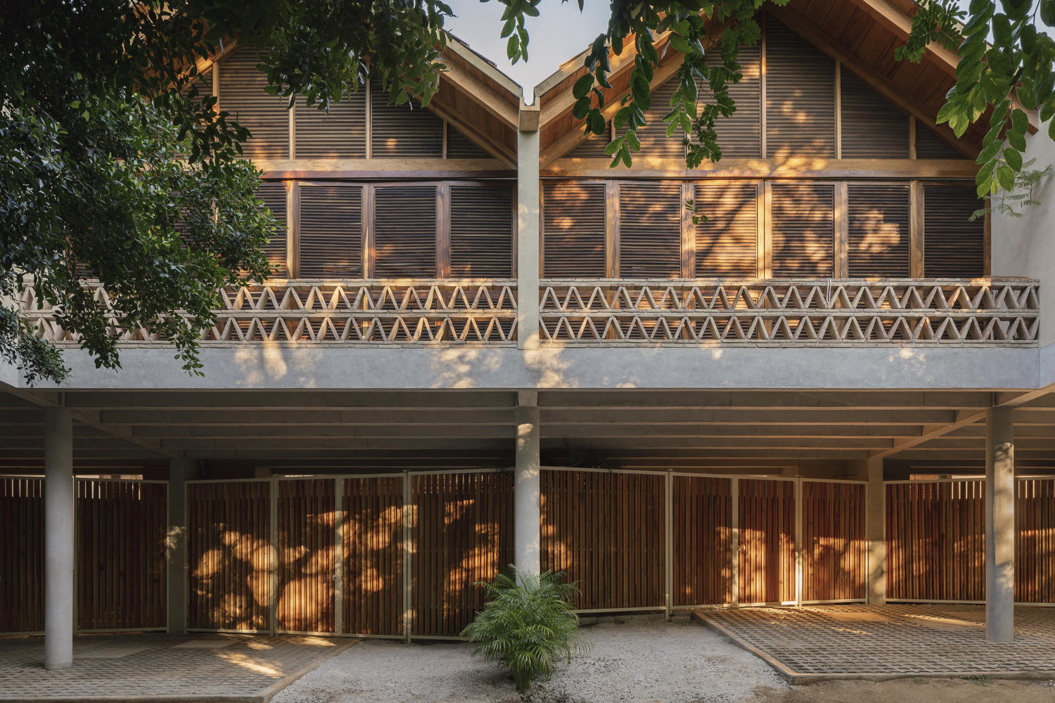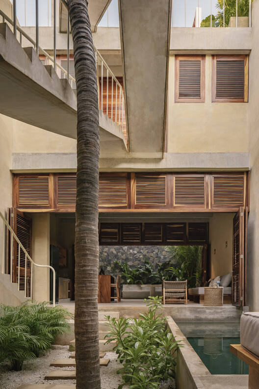 Text description provided by the architects. The Palmeras project consists of five small houses of 100 m2 with 2 bedrooms, a living room, a dining room, a small pool, a rooftop and a parking space. This complex is located on the coast of Oaxaca on a lot approximately 250 meters from the beach. The lots where the houses are designed have a frontage facing the street of approximately 6 meters wide and an average depth of 21 meters inland.
