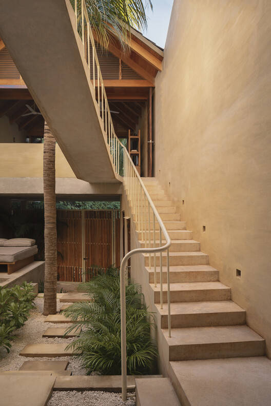 每个车身的连接都是通过一个曲折的楼梯实现的,这个楼梯可以通往前后车身的不同半层,并激励人们使用整个场地并完整地生活。楼梯还可以作为长廊,从不同的角度欣赏房子。房子的最后一部分在屋顶结束,让您在项目中第一次发现瓦哈卡美丽海滩的海洋地平线。