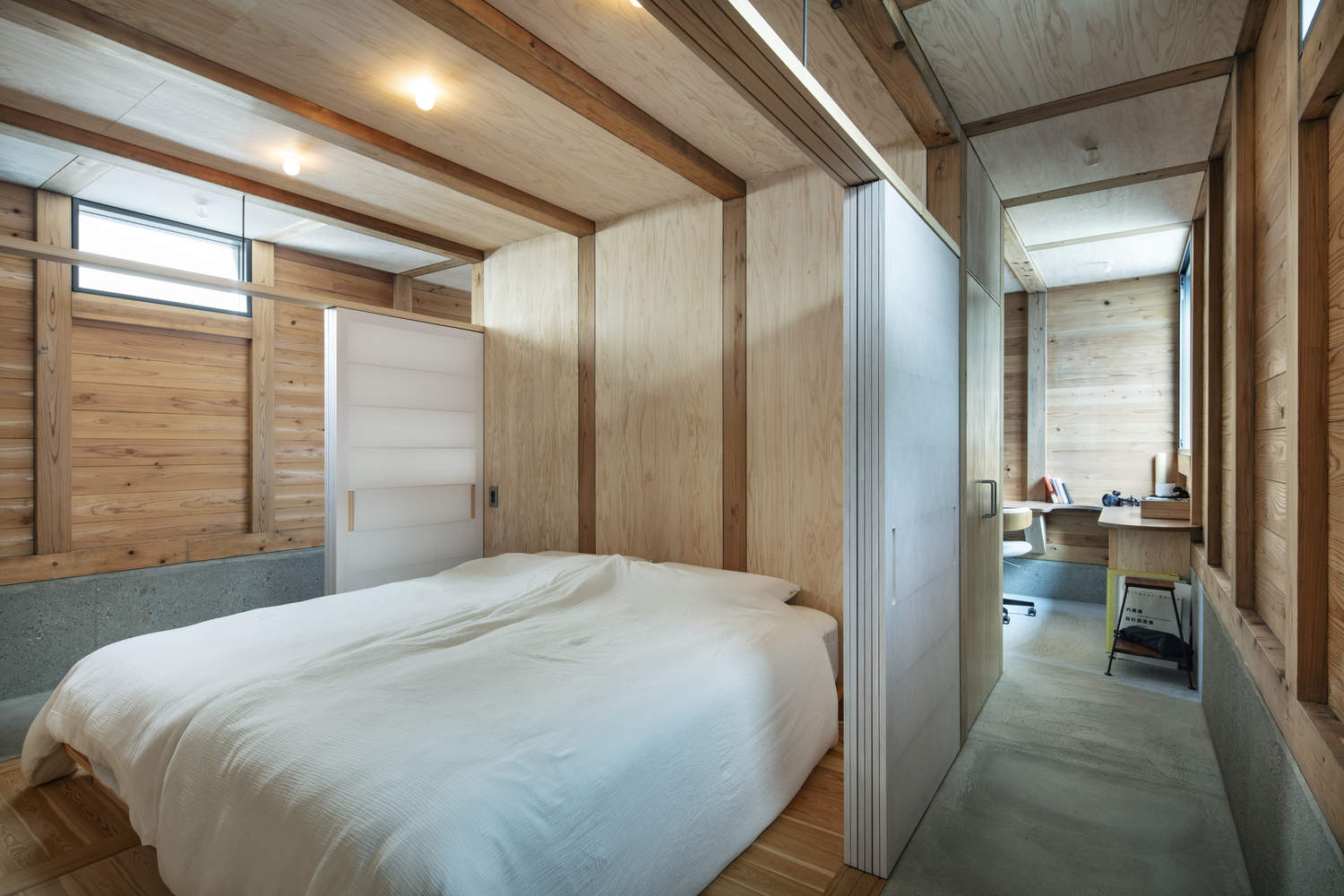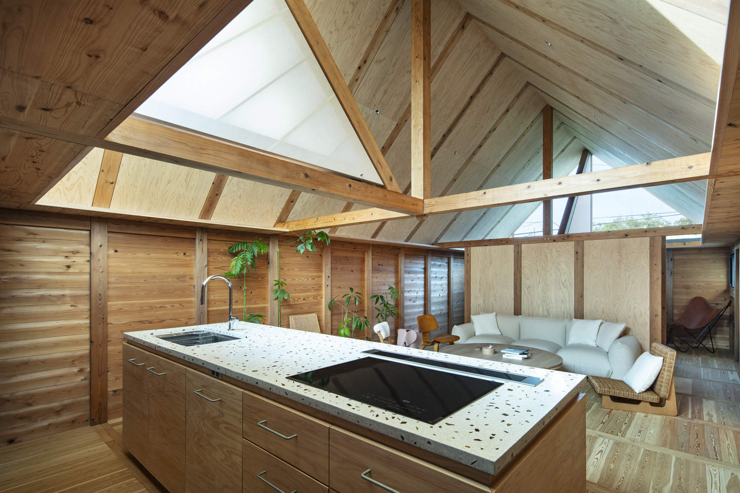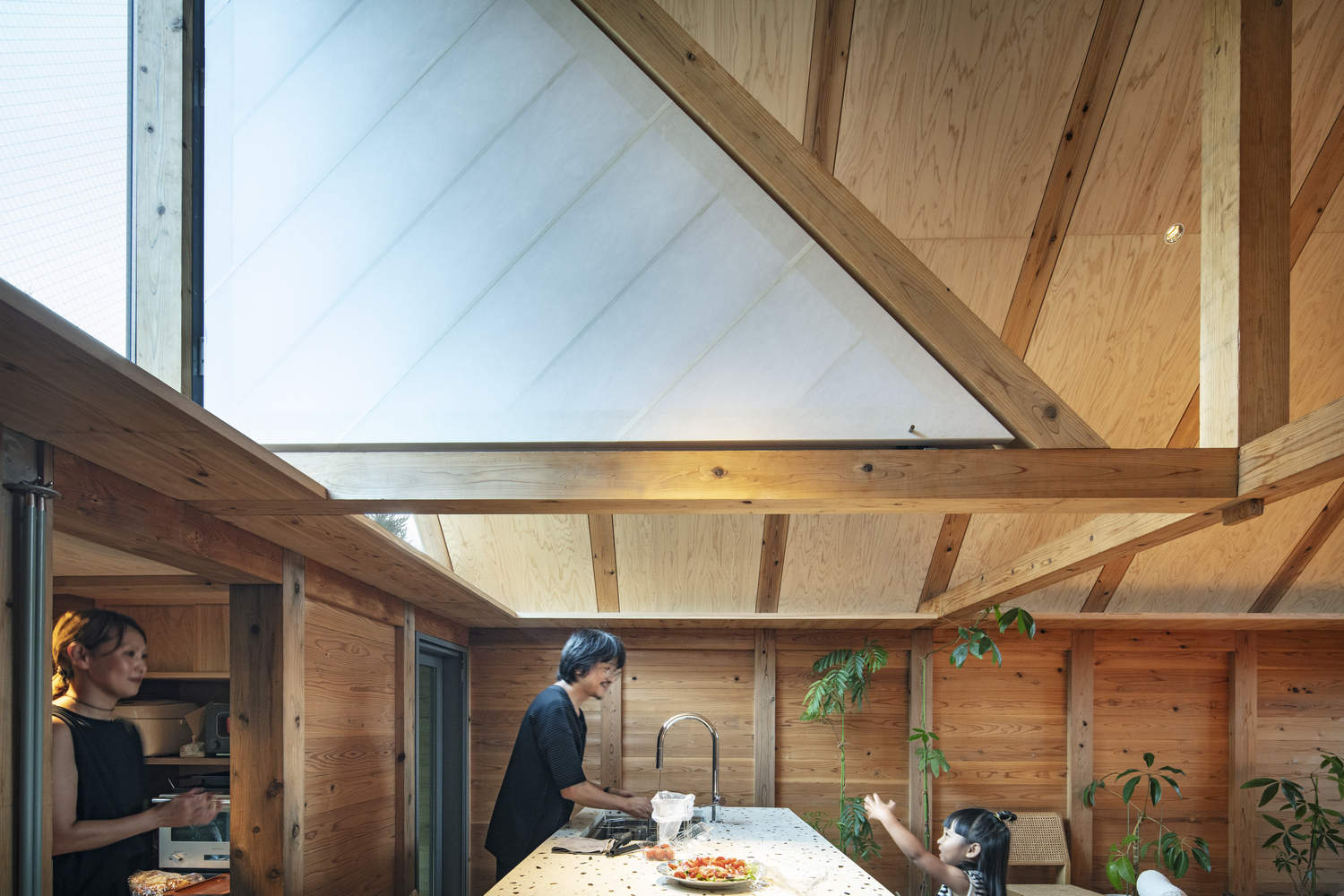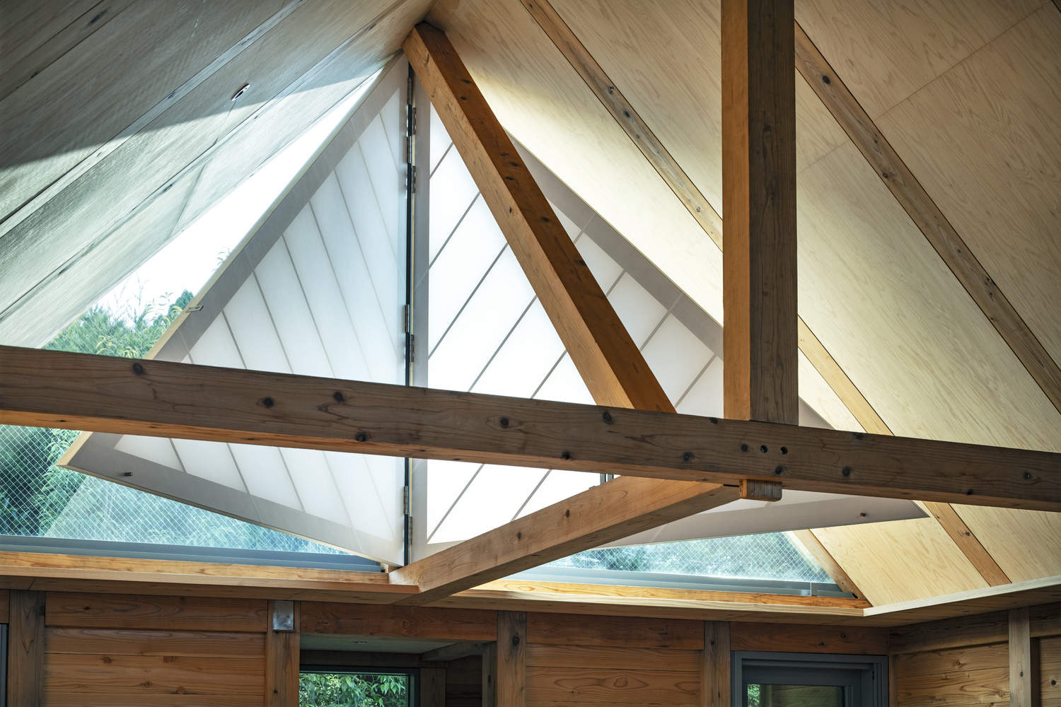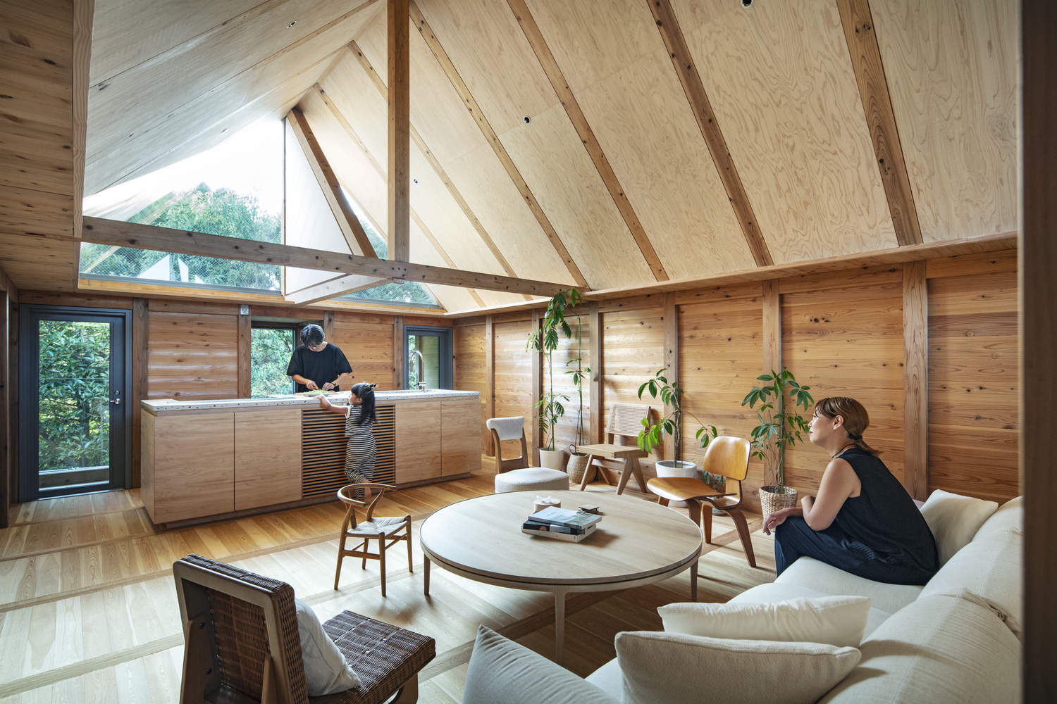 Triangular shoji screens, aligned with the roofline, transform the space: when open, they divide the rooms while allowing natural light to flow in; when closed, they connect the spaces, blocking light and enhancing the spatial experience. This design seamlessly combines functionality, beauty, and adaptability to its environment.
