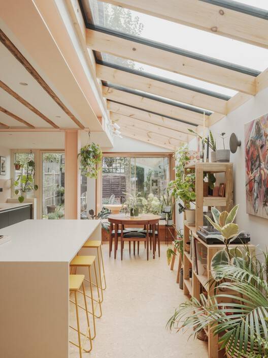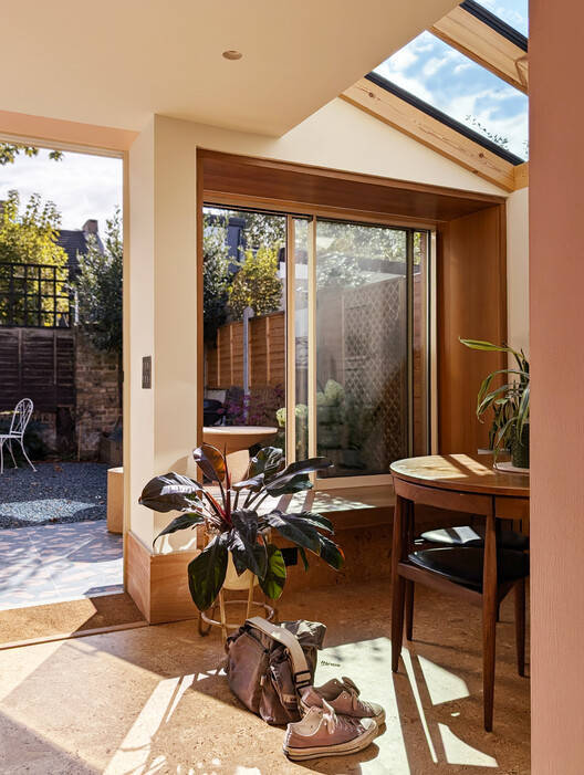 Text description provided by the architects. This re-imagined Victorian home in Forest Gate revitalises a traditional terraced property, creating a space tailored for simple living and entertaining. With an emphasis on tactile natural materials, playful accents, and expansive openings, this home elegantly bridges the indoors and outdoors, creating a space that feels both intimate and open. The clients, whose previous home lacked natural light, sought to make the most of their new south-facing garden by bringing sunlight into the interiors and opening the new extension as much as possible toward the outdoors. Large sliding windows, a pivot door, and full-length roof lights flood the space with light, creating a warm and vibrant atmosphere.