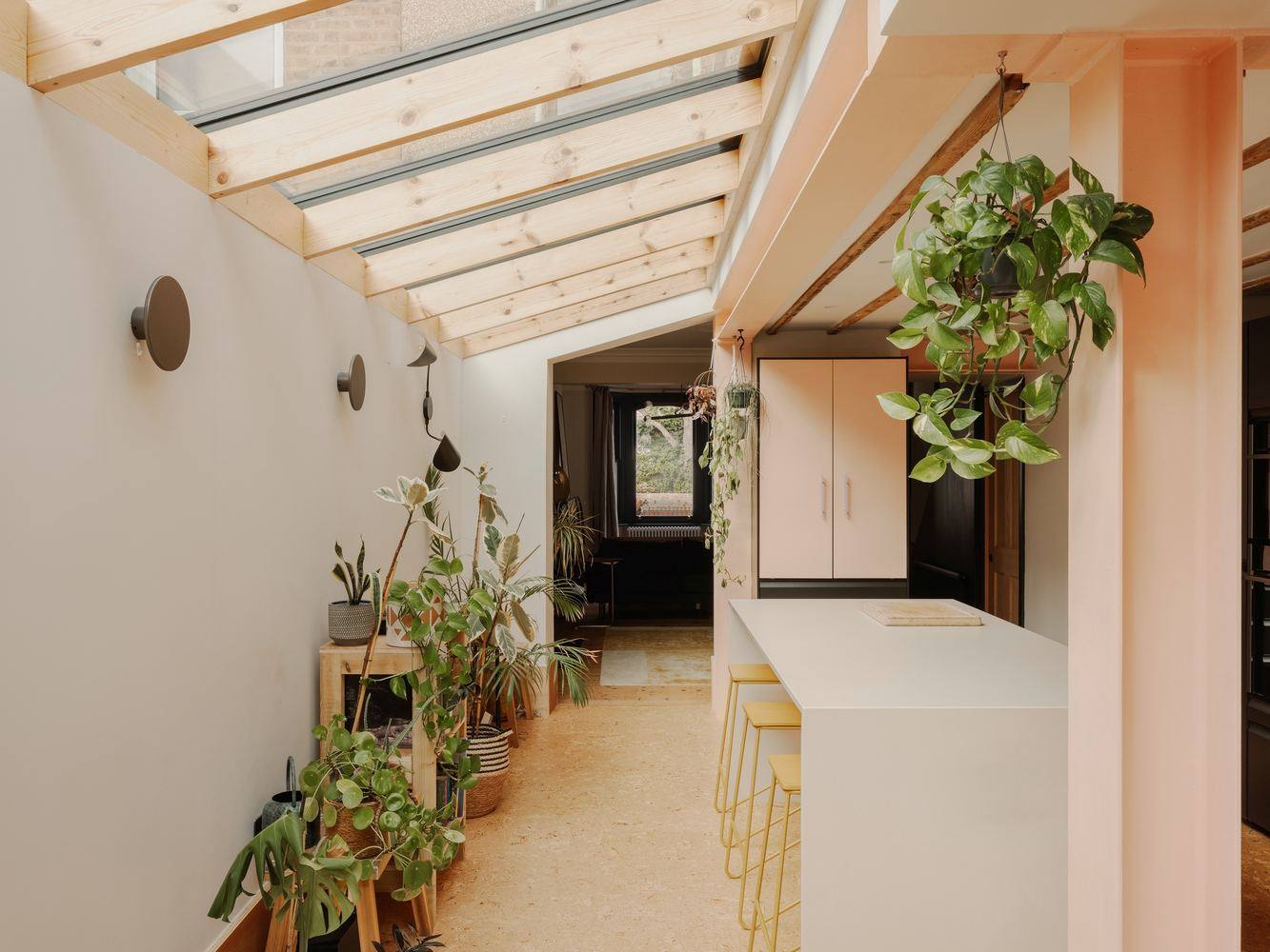 Playful design elements — such as the retained, slightly askew old joists above the kitchen, unique cork flooring, and bold pink steelwork — add character and capture the homeowners' vision. Tall skirting boards and occasional vertical surfaces in cork give the impression of the walls sinking into the warm cork floor, enhancing the cosy, inviting atmosphere. A bespoke timber window bench serves as a versatile in-between space, ideal for writing or enjoying the view in winter, and becomes a shared indoor-outdoor dining spot in warmer months. The clients' brief emphasised the importance of entertaining and casual seating options, with the bench offering a welcoming setting for gatherings.
