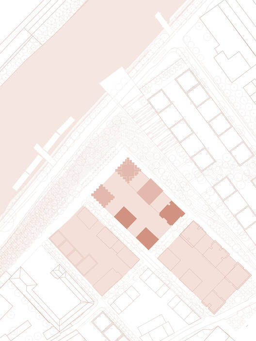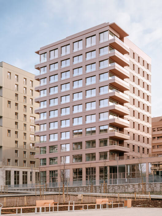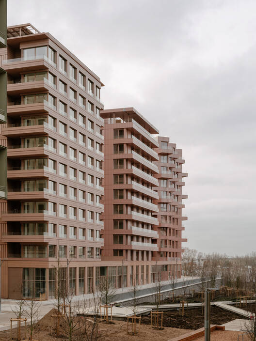 Text description provided by the architects. The project sits on the banks of the Seine, in Saint-Ouen, at the heart of the Paris 2024 Olympic and Paralympic Village. It is built on a former 19th-century industrial site. The urban project, designed by Dominique Perrault, features large "ships" perpendicular to the Seine, with a common skyline for each of the bases: "the waterline." The Belvedere block is one of these ships, set on the Mail Finot, the major landscaped area in the Village. At the center of the block, SOA has created a tall building (R+10) and two smaller buildings (R+5 and R+6) on the rear street.