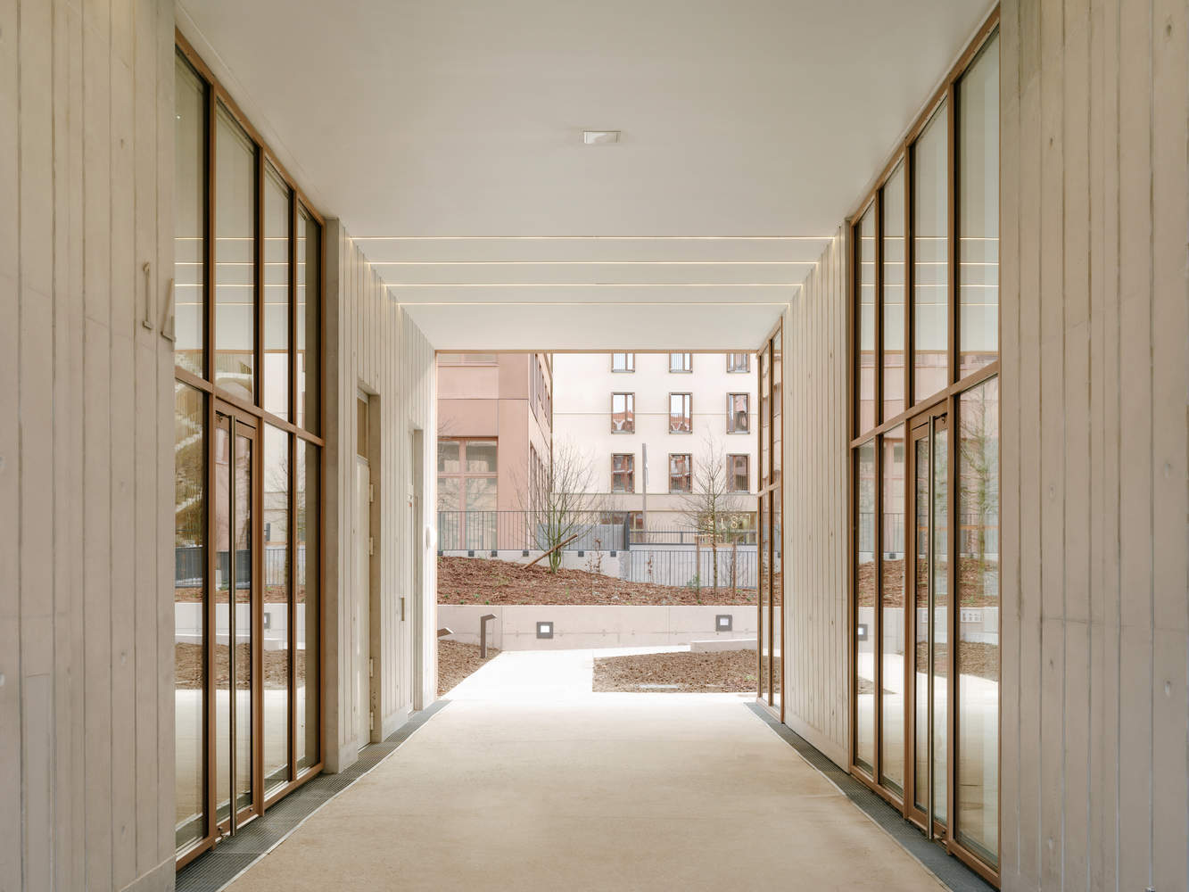 All the apartments in lot E1-B, except for a few studios, have dual orientations. They are designed around a common principle: the living rooms, located at the corners, benefit from multiple and unobstructed views. The kitchens and living rooms are arranged around a loggia or along a generous balcony. The steel cladding of the main building protects it from the elements and also ensures, through a system of consoles, corbels, and ties, the extension of the exterior spaces and their planted gardens.