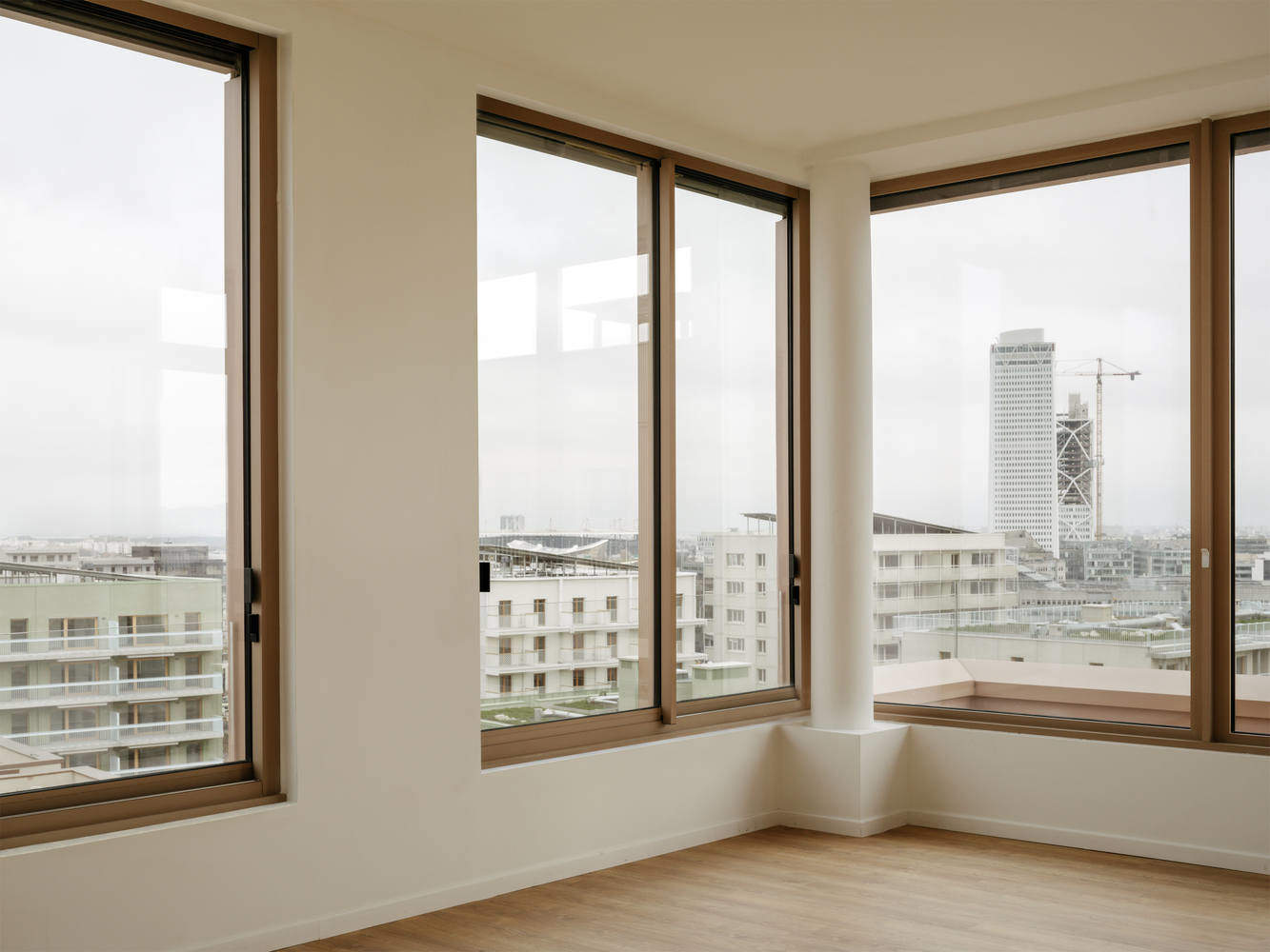 According to bioclimatic design, the facade openings are based on orientations. Large openings to the north onto the Mail Finot, provide a wide view of the urban perspective from the living room. Medium-sized openings to the south are protected by deep terraces. And small openings to the east and west for the bedrooms, reducing visibility into neighboring buildings. The overall opening ratio optimizes the thermal performance of the building.