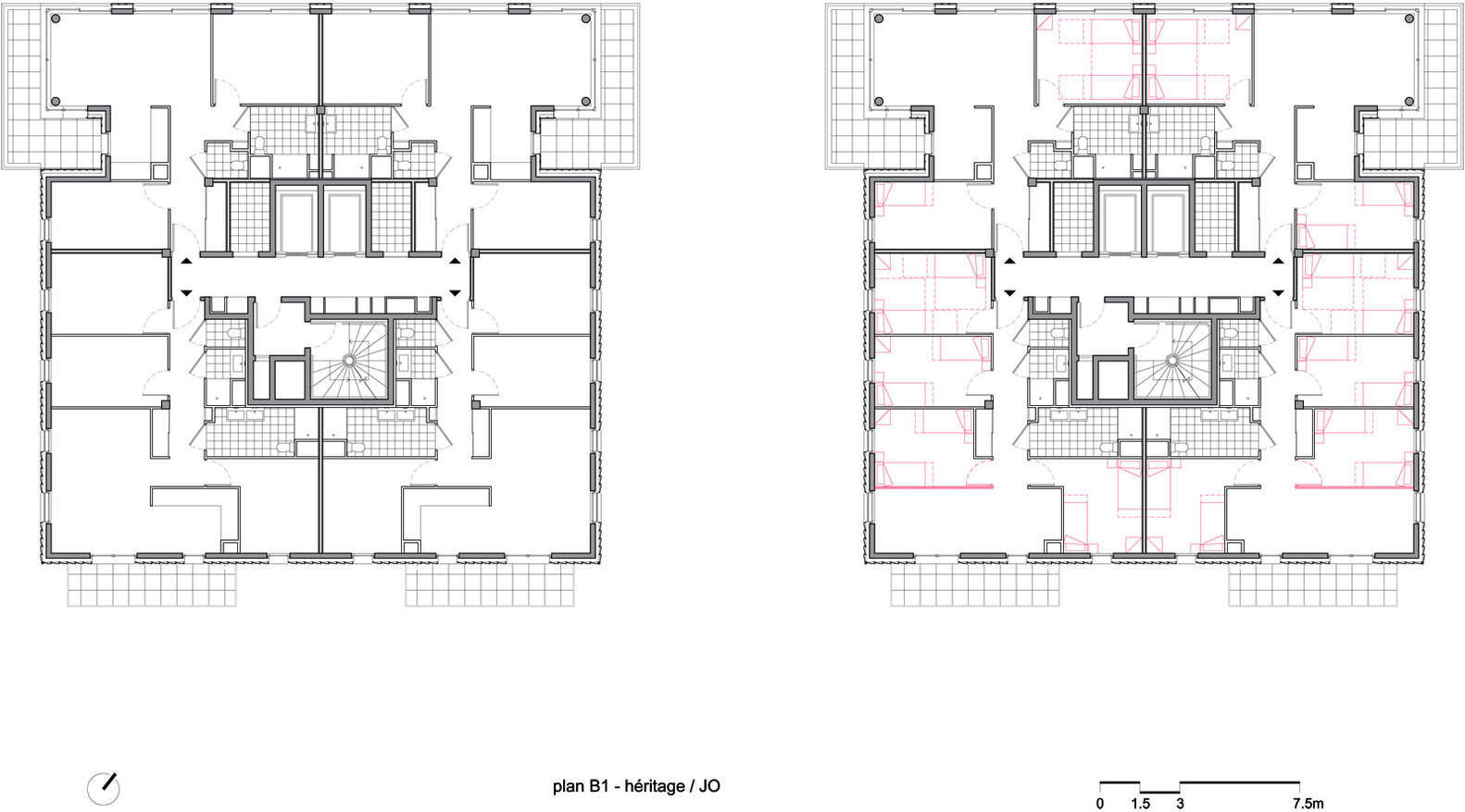 除少数工作室外,E1-B地块的所有公寓都有双朝向。它们是围绕一个共同的原则设计的:位于角落的客厅受益于多个无障碍的视野。厨房和客厅围绕凉廊或沿着宽敞的阳台布置。主楼的钢覆层保护其免受自然因素的影响,并通过控制台、牛腿和系带系统确保外部空间及其种植花园的延伸。