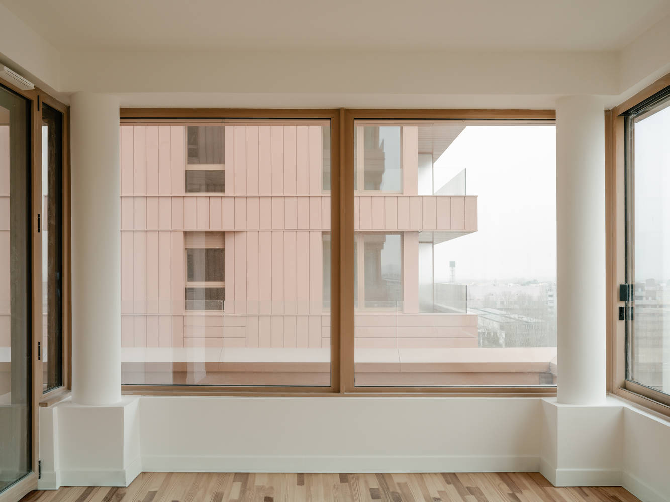 The buildings on the Mail are connected together by a monumental two-level urban plinth. This base contains a dual-aspect hall and its large bicycle storage area, creating a visual connection between the Mail and the heart of the block. The color of the facades results from a collaboration with contemporary artist Morgane Tschiember and AkzoNobel factories around the concept of "skin building." The idea is to represent the fusion of the iconic red brick of Saint-Ouen with the various tones of the skin. We had to take advantage of the considerable thickness of 21 meters by 21 meters from the master plan. Servant spaces and floor cellars are nested at the core of the building, hence freeing up the perimeter.