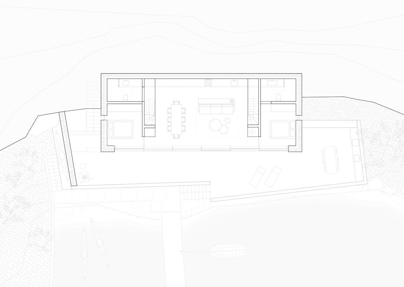 为了保护遗址的质量,该项目利用现有的复杂地形找到了自己的位置。该计划分为两个层次。一侧的睡眠区位于两侧和两层。另一方面,利用建筑的部分,日间空间被放置在中央模块中。不同的空间通过玻璃幕墙系统纵向照明。在夏天,所有的开口都完全展开,机舱呈现出一个简单的亭子——一个在宽敞的盖子下的受保护的室外厨房——允许与周围环境建立各种关系。