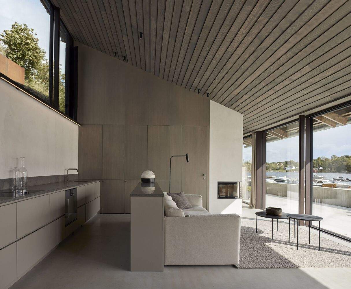 空间与光影体验:该项目在空间设计上注重与自然的互动。通过玻璃幕墙系统,建筑内部空间得以纵向延伸,自然光线充分渗透,营造出明亮而通透的室内环境。夏季时,所有开口完全展开,建筑仿佛成为一个简单的亭子,将室外厨房与海景融为一体,模糊了室内外的界限。这种设计不仅增强了空间的灵活性,还为居住者提供了丰富的光影体验和与自然亲密接触的机会。