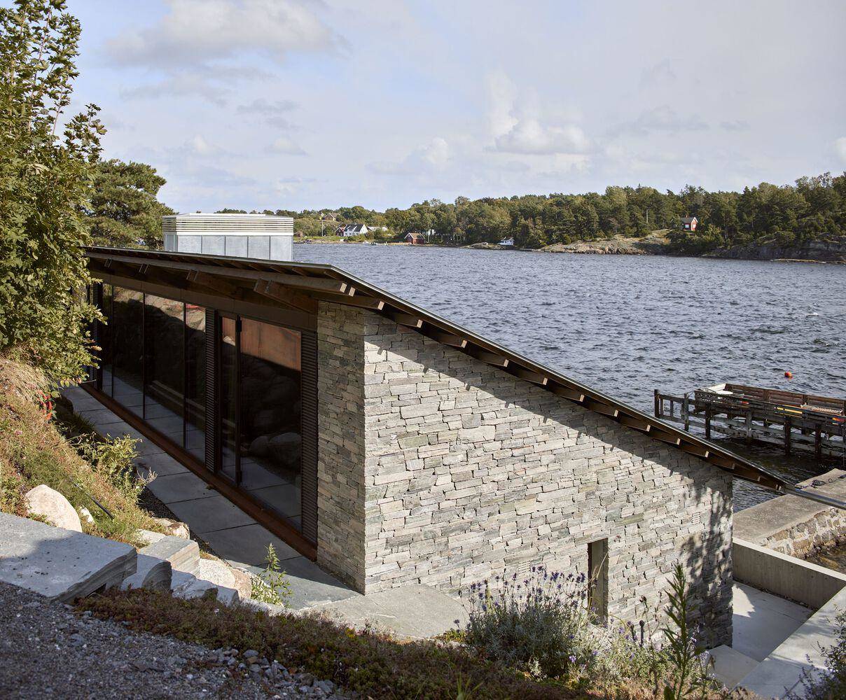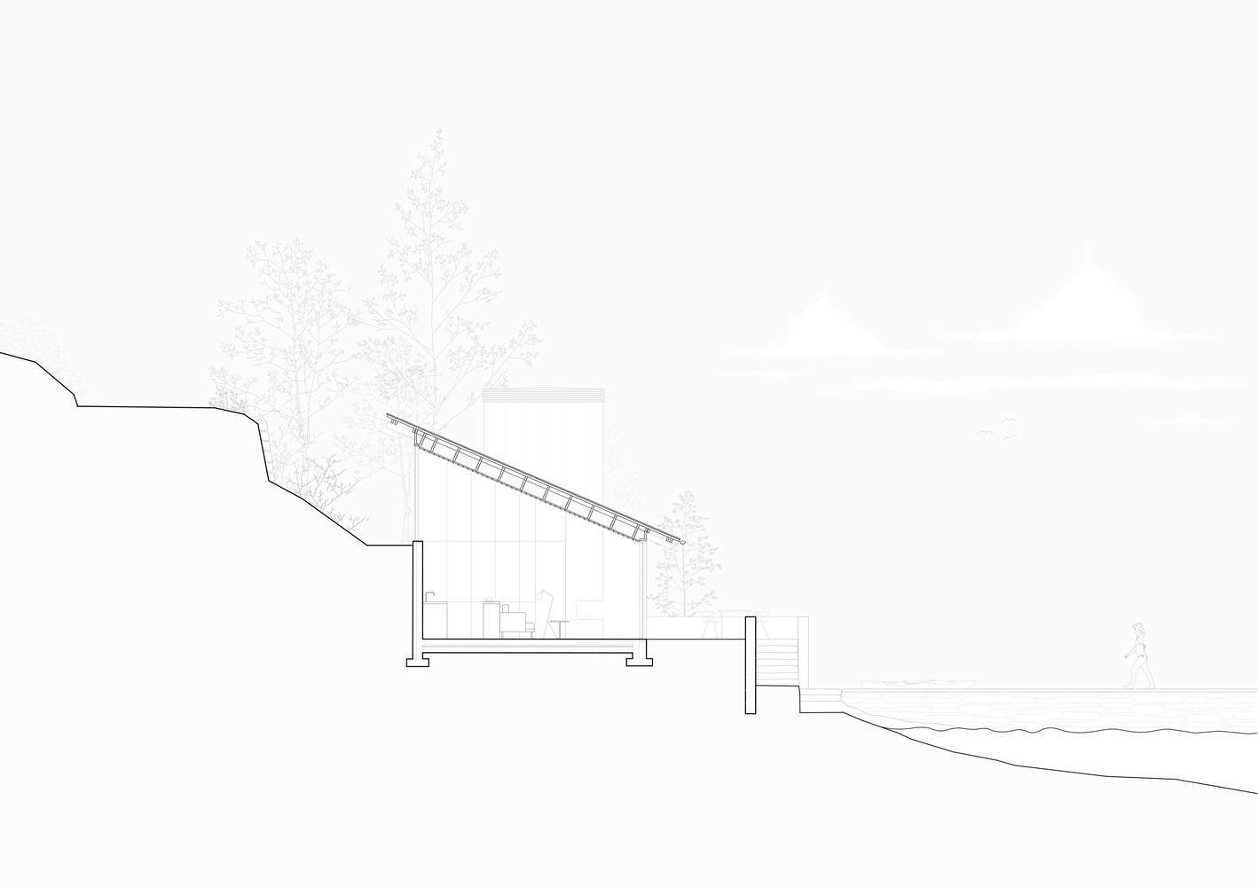 建筑师提供的文字描述建议设计和建造一个非正式的周末小屋,该小屋位于奥斯陆峡湾的Nøtterøy市田园诗般的沿海地区。项目位置和方向的主要前提是:街道和现有码头之间的狭窄场地,陡峭复杂的施工地形,以及以Færder国家公园为背景的壮观海景。