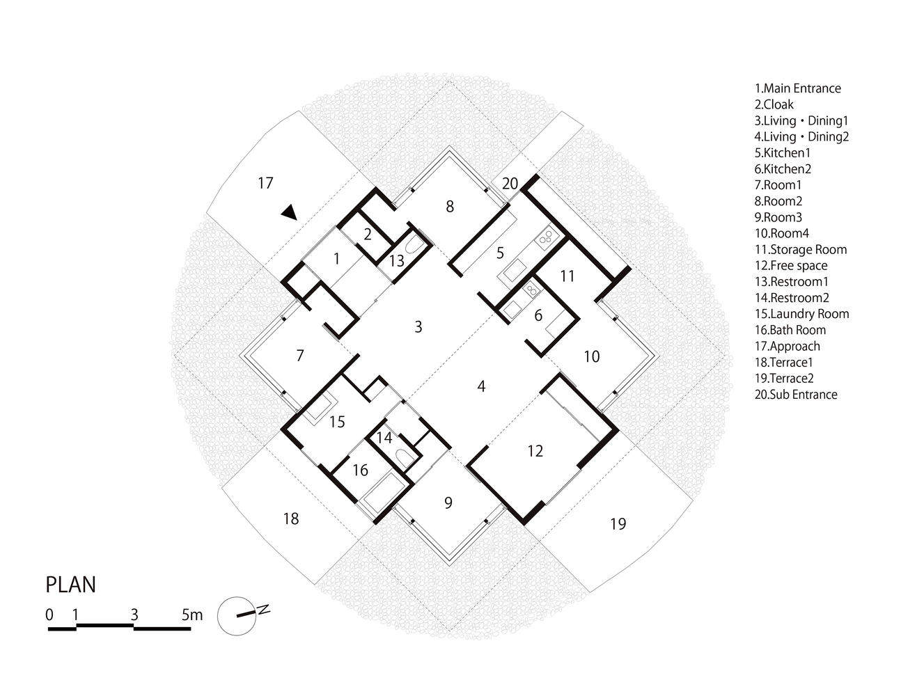 场地与布局的巧妙融合:House U的选址位于郊区农业区,周边自然环境丰富多样。东侧稻田、南侧森林环绕的神社、西侧住宅区和北侧田地形成了独特的景观背景。设计师巧妙地利用场地特点,将建筑置于狭长场地的中心,形成紧凑的方形布局,并规划了北侧私人花园和南侧开放式花园。这种布局不仅最大化地利用了场地空间,还为居住者提供了丰富的自然景观体验,同时兼顾了隐私性和开放性,展现了对场地的深刻理解和精准把握。
