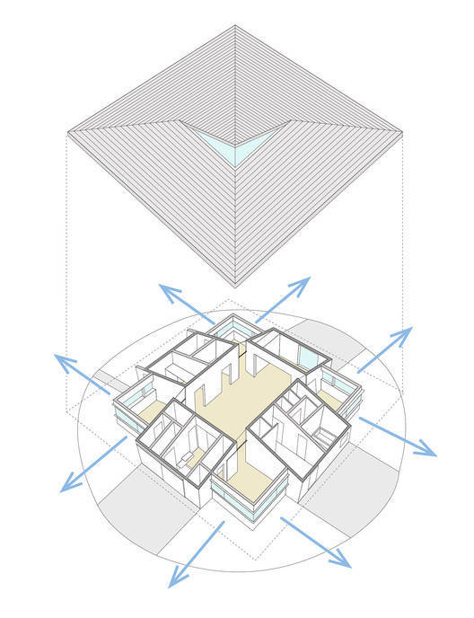 所有房间相关的中央空间被改造成了一个公共空间。我们设计了一个大屋顶来阻挡这个地区特有的强烈阳光和风雨,并在屋顶的一部分提供了一个很大的开口,将自然光引导到没有窗户的中央空间。
