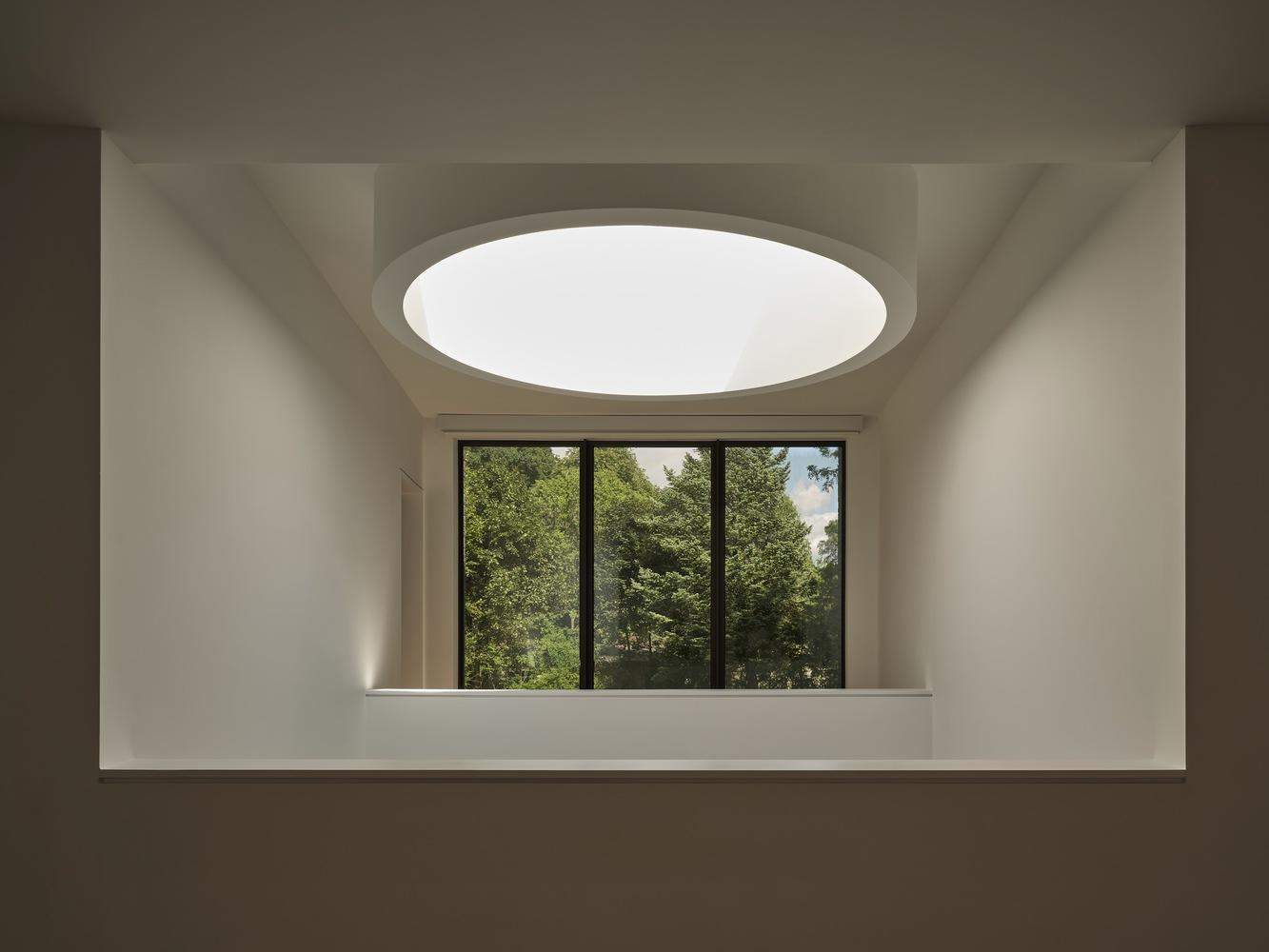 The project features many exterior and interior designs and architectural details. Particularly, the U-shaped staircase is designed to express and celebrate the 10° angle rotation, by centering the two staircase flights to different rectangular volumes. The trapezoidal skylight is placed at the top of the staircase shaft, bringing natural light all the way down to the basement through the central void. On the ground floor, the third step of the staircase transforms into a built-in bench, curved along the staircase wall, which acts as a waiting room between the main entry and the home office. On the outside, all the windows on the two rectangular volumes are recessed over 2' and the main entry over 6'. By grouping multiple windows into four massive, recessed openings, scaled to the buildings rather than a human body, the sun casts large, sharp, and uninterrupted light and shadow on the building surfaces, engaging in an intimate conversation with the building. The house exudes a sublime presence, resisting a typical image of a house as represented in the area yet surrendering to the natural environment.
