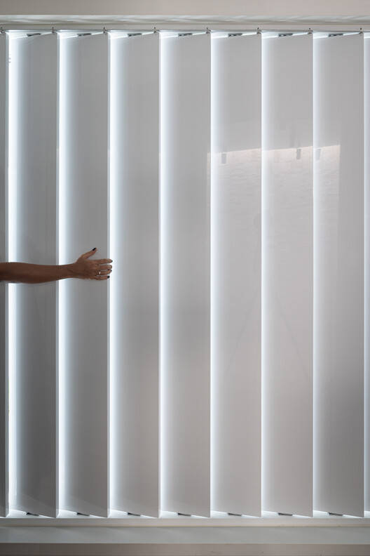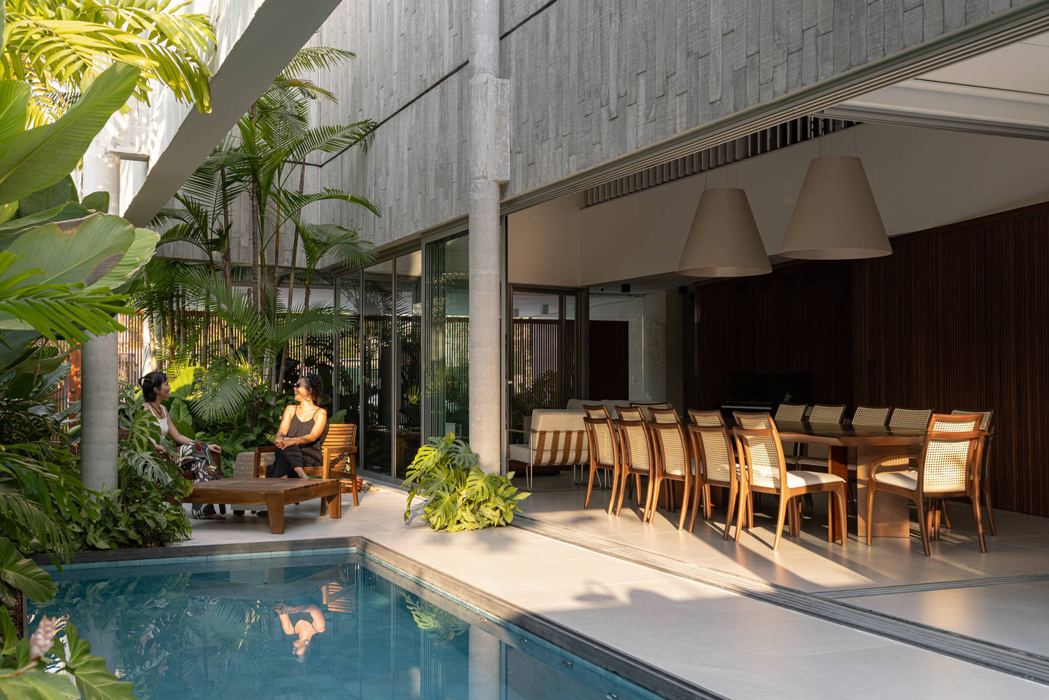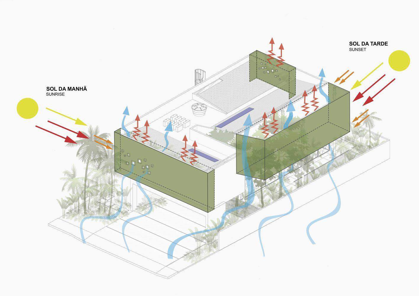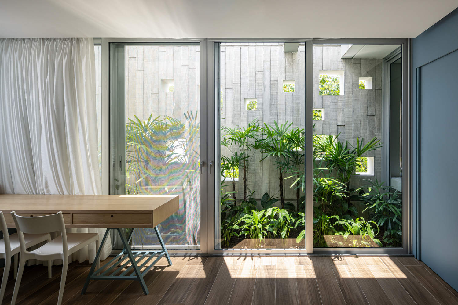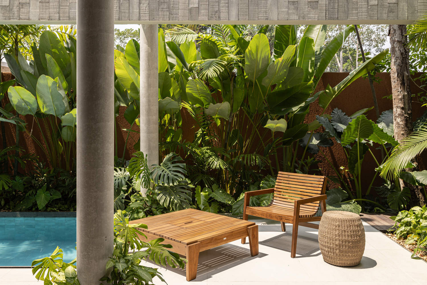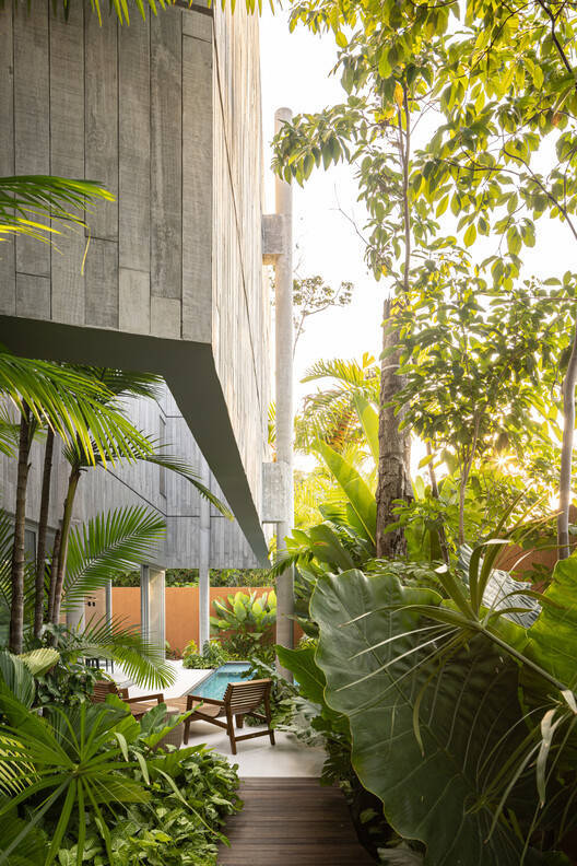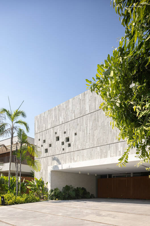 To prevent direct sunlight from penetrating the interior of the house, concrete walls were designed to filter the light before it reaches a glass wall positioned behind the interior and exterior gardens, located in the cutouts of the concrete volume. Between the garage and the living room, as well as on the upper floors, the gardens of the suites offer views of the street and surroundings while ensuring the necessary shading and preserving the trees on the property.