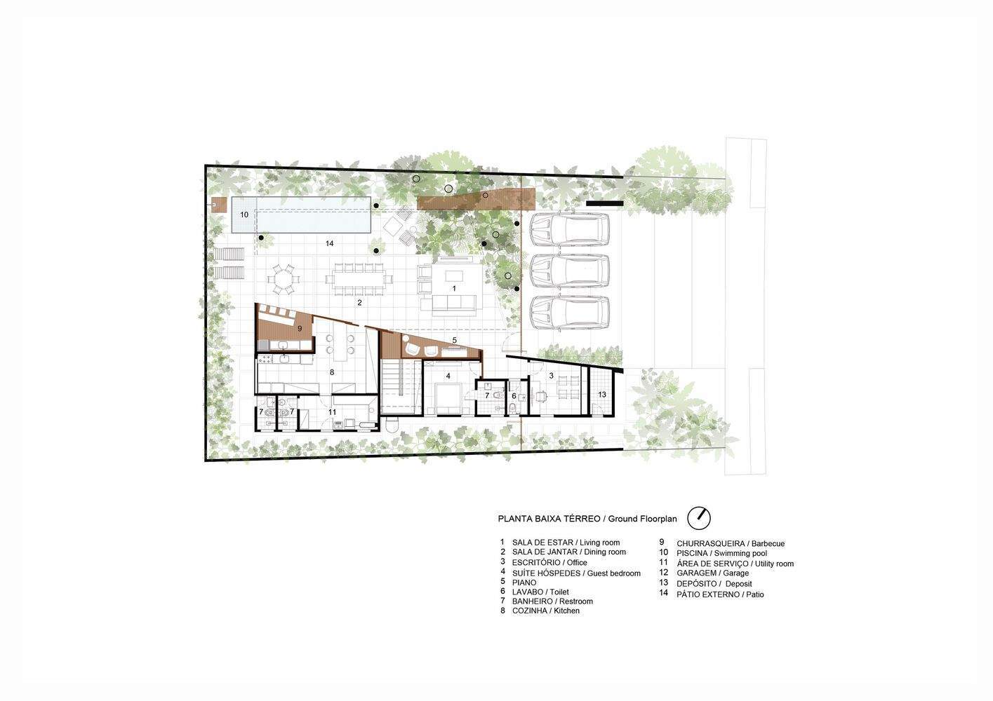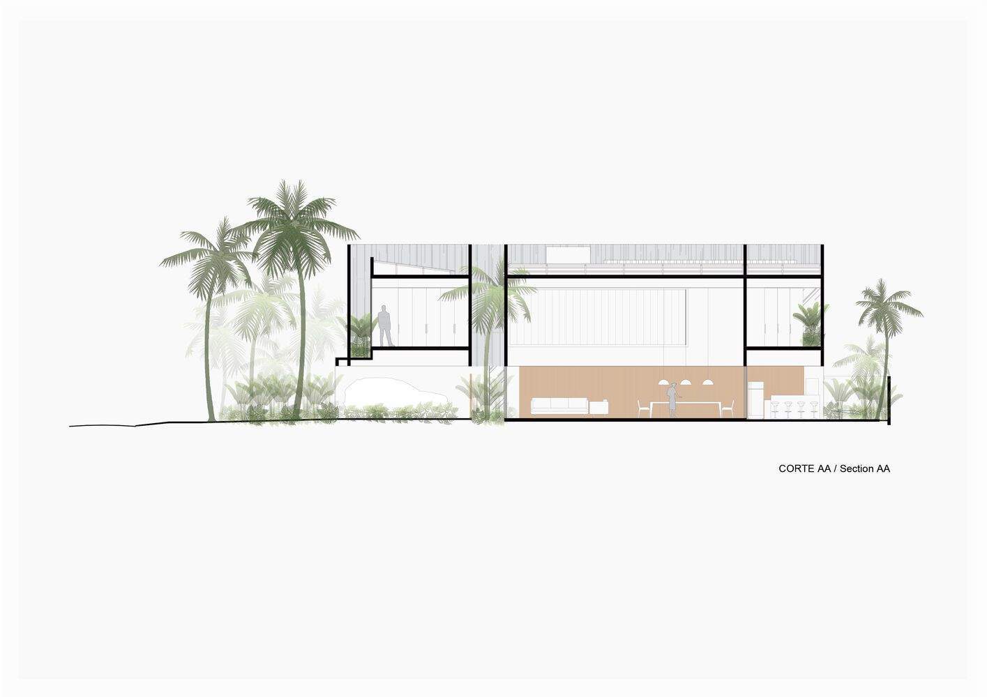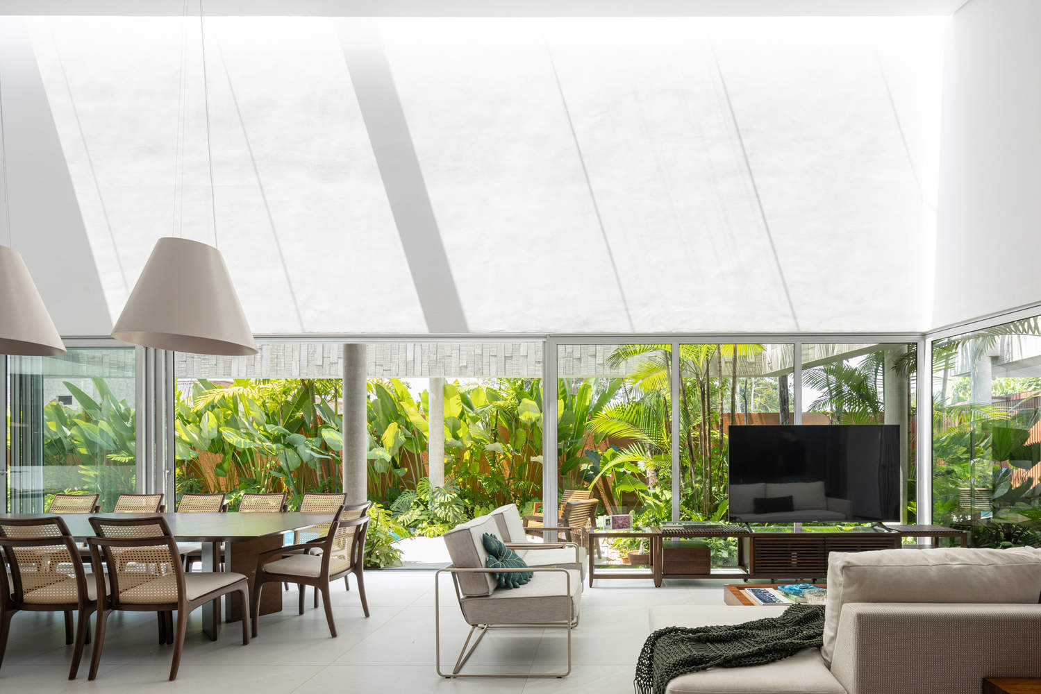 Inside, the living room was designed to integrate with the garden at the property limits, maximizing the feeling of spaciousness. A wooden panel occupies the southern side of the floor plan, providing privacy for specific areas, such as the family's piano space, and also housing access to the upper floor, kitchen, and barbecue area. The other areas of the living room were kept open, promoting visual connection with the outdoors.