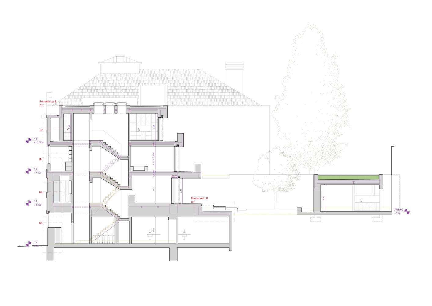 The existing construction was well built, so we decided to keep it, raising its height to the cornice of the adjacent building. On closer examination of the main façade we recognized, with great surprise, the Art Deco features from the 1930s, so we speculated whether we could bring out the 3 eras of the house – 1930, 1980 and 2020 – simultaneously. We visited Florence during this process and found the solution in urban palaces extended, generation after generation, with a material and technical progression from robust – base – to slender – loggia – without mimicry or counterpoint. By superimposing the front elevations of the 1930s and 1980s we arrived at regulating lines that revive the uniqueness of each element within a coherent compositional structure. These lines contour the building, designing the gable, back façade, garden and studio. The continuity of horizontal lines allows the upper floors of the house to retreat, opening the garden to the Sun and the sky.