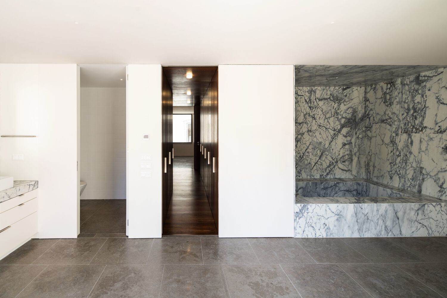 房子是通过一个有盖的户外空间进入的,从那里可以看到花园。内部楼梯作为另一个实体出现,它发展、展开并逐渐填充空间。我们在几个项目中多次探索了这个想法,但这种探索从未像语言那样明显。