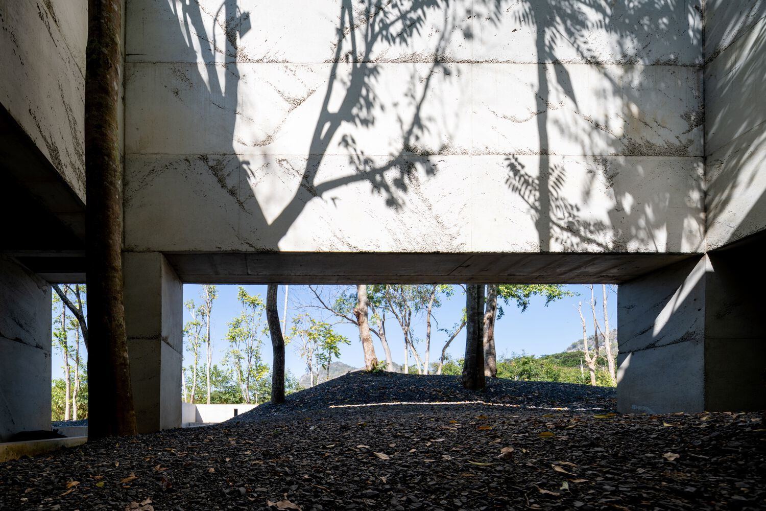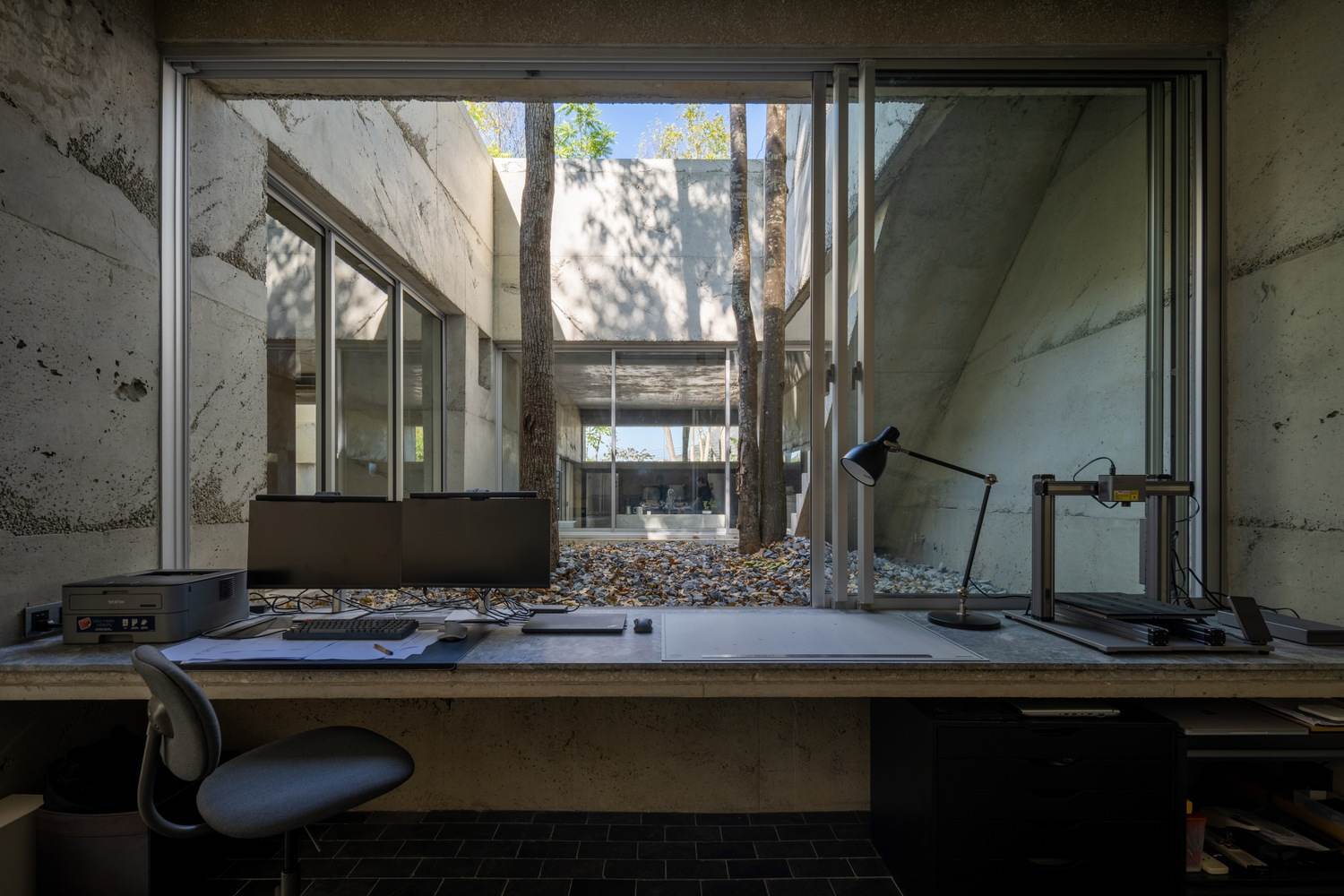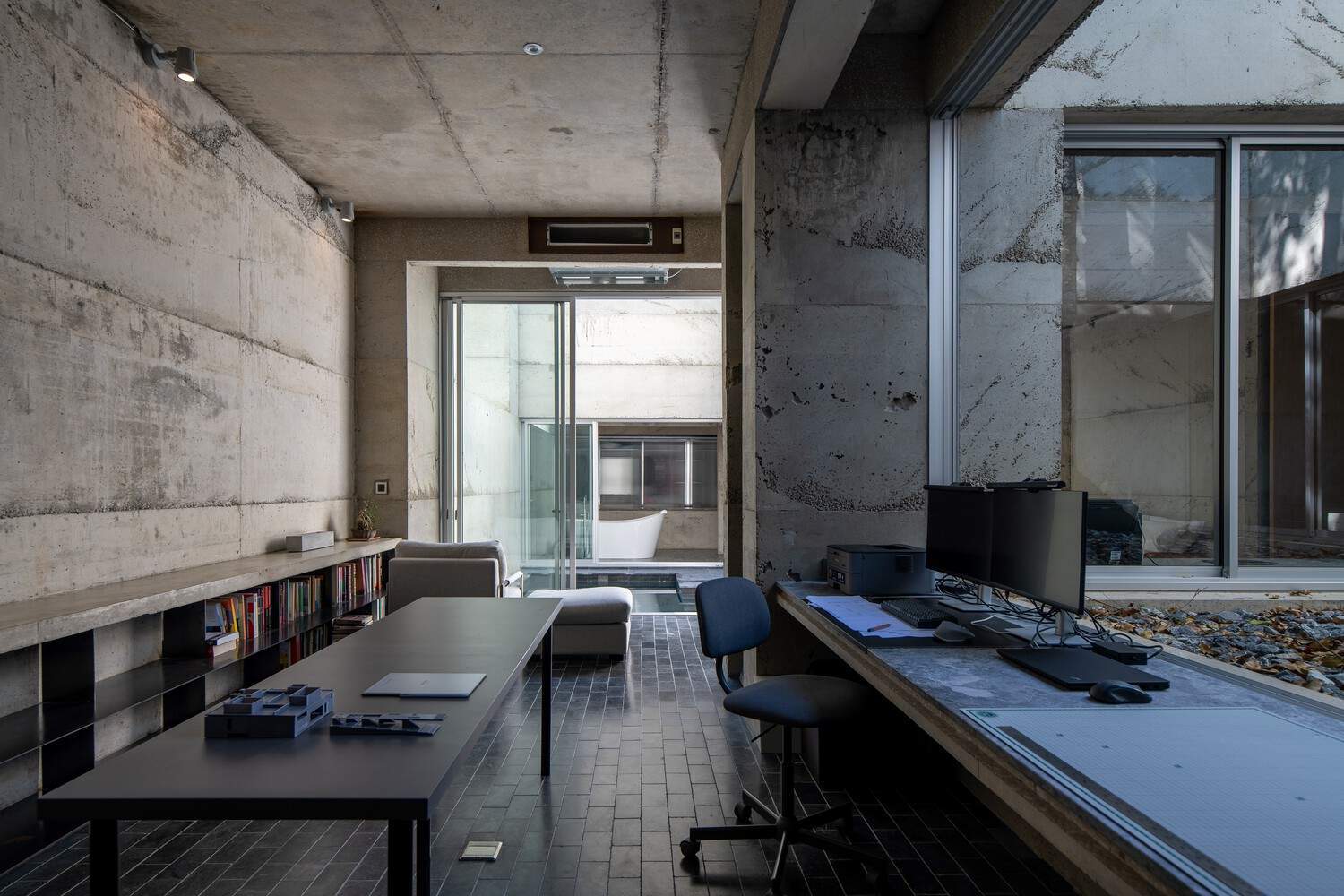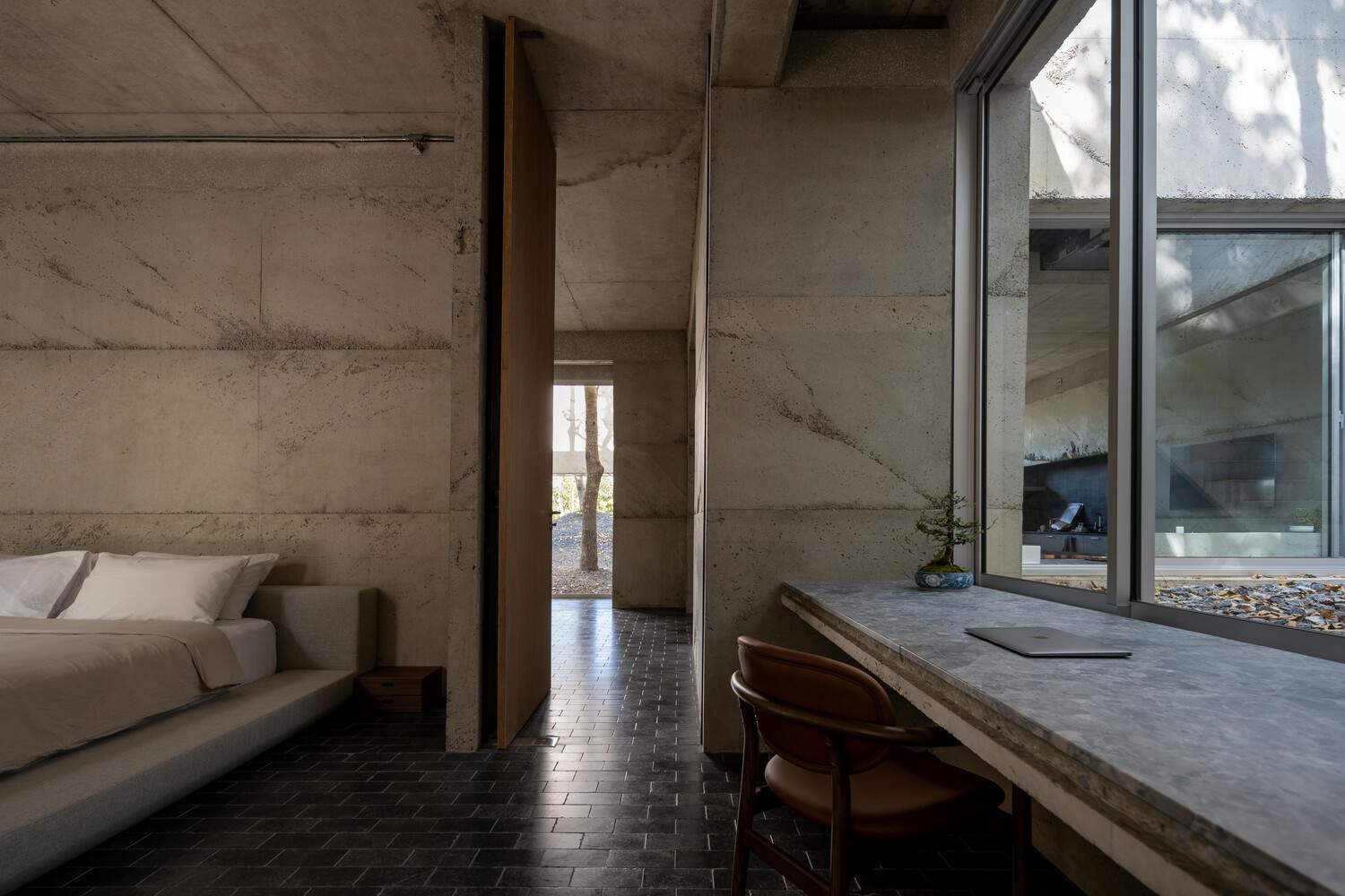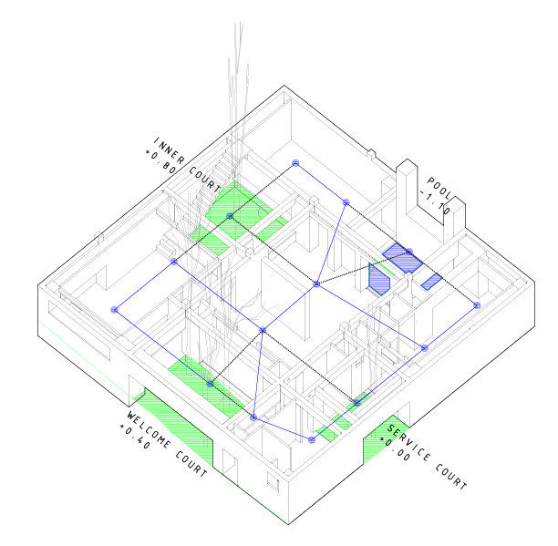 In addition, all the courts not only create functions around them but also connect the surrounding area. So, the "outer spaces" are connected to a circular area around the "inner space." The court and its surrounding space are dissolved by daylight and fresh air, which flows from one space to another. In the same way, the view of space is connected by material, which is the "concrete skin".