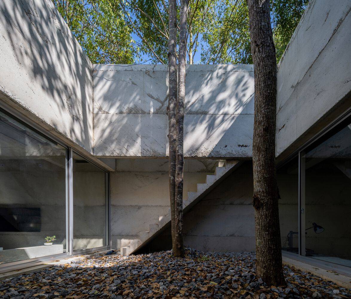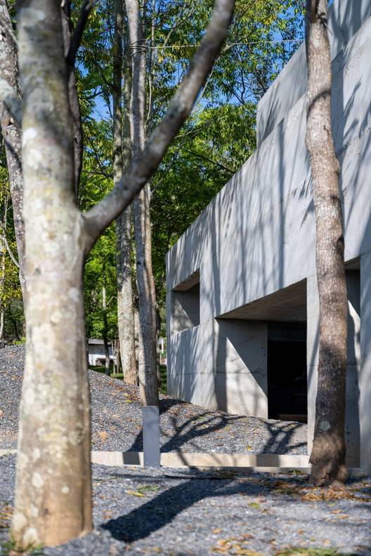 建筑师提供的文字描述Text description provided by the architects. Yellow House is situated in a sloped area that is surrounded by a lot of big trees scattered all over the site. The house consists of two main parts. The first is the "inner spaces," composed of highly private functions. And they are surrounded by "outer spaces," which are composed of less private functions. The "outer spaces" are open-air courts that are situated on four sides of the house.