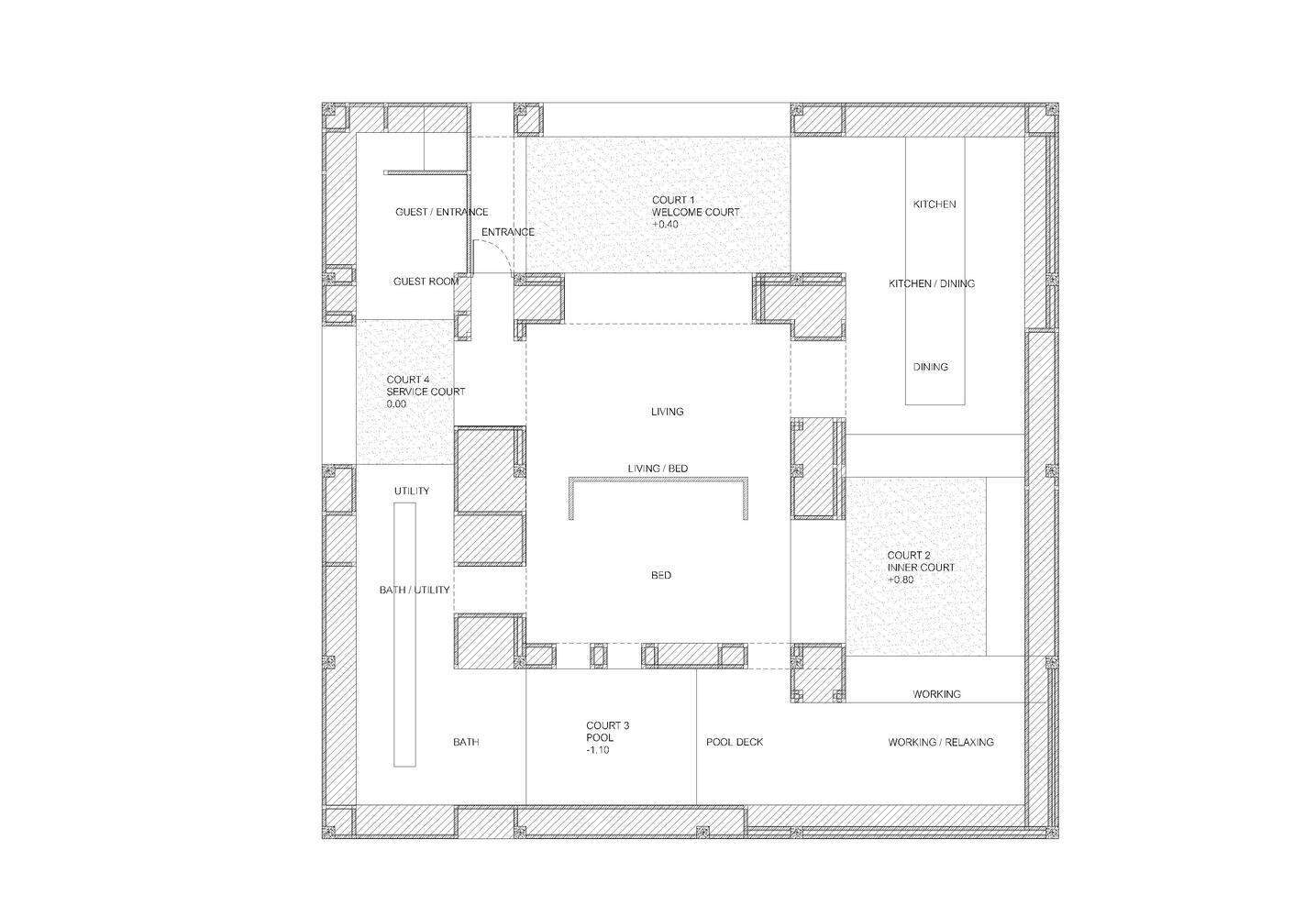 This court allows daylight and air into the "inner spaces." All four courts have their own character in terms of scale and dimension, depending on their orientation to maintain the existing trees and slope of the ground. And because of the courts' position, they have their own functions and define the functions of the area around them. Such as: