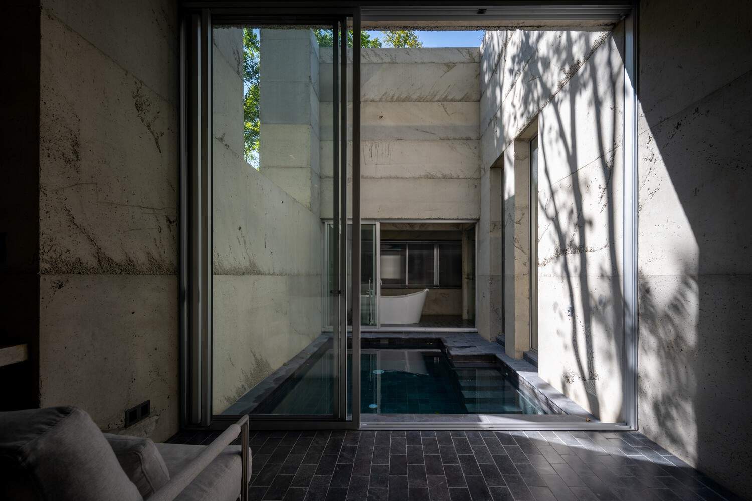 此外,所有法院不仅在其周围创造功能,而且还连接周围地区。因此,“外部空间”与“内部空间”周围的圆形区域相连。庭院及其周围的空间被从一个空间流向另一个空间的日光和新鲜空气所溶解。同样地,空间的视图是由材料连接起来的,这就是“混凝土表皮”。