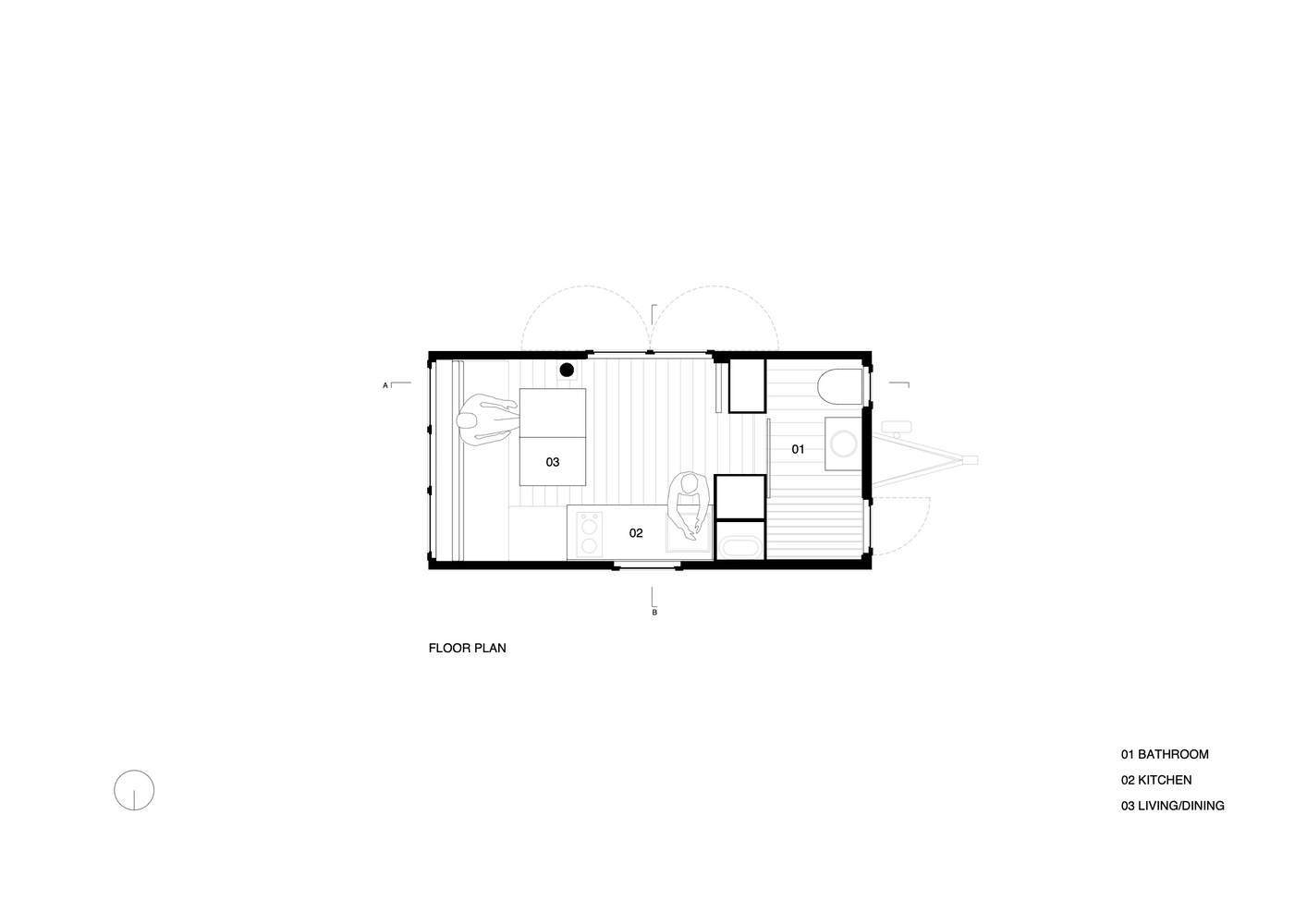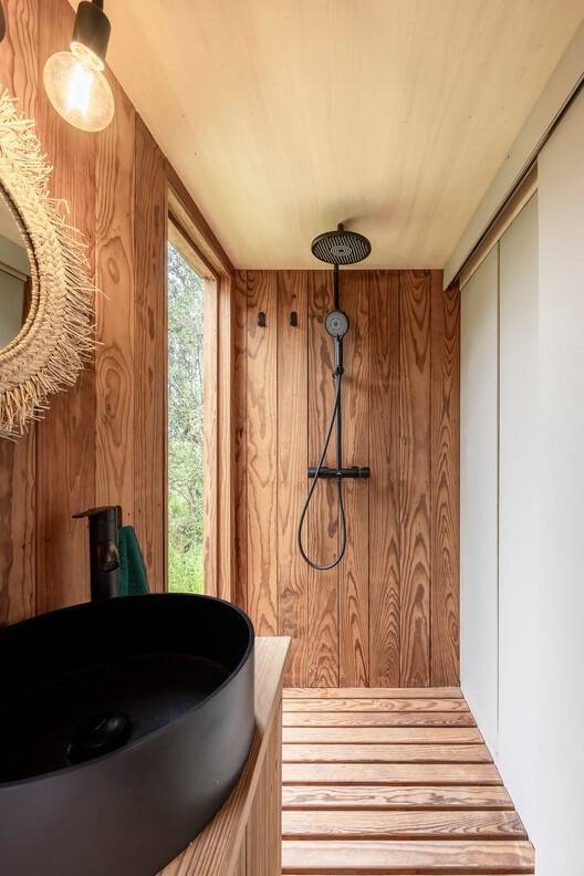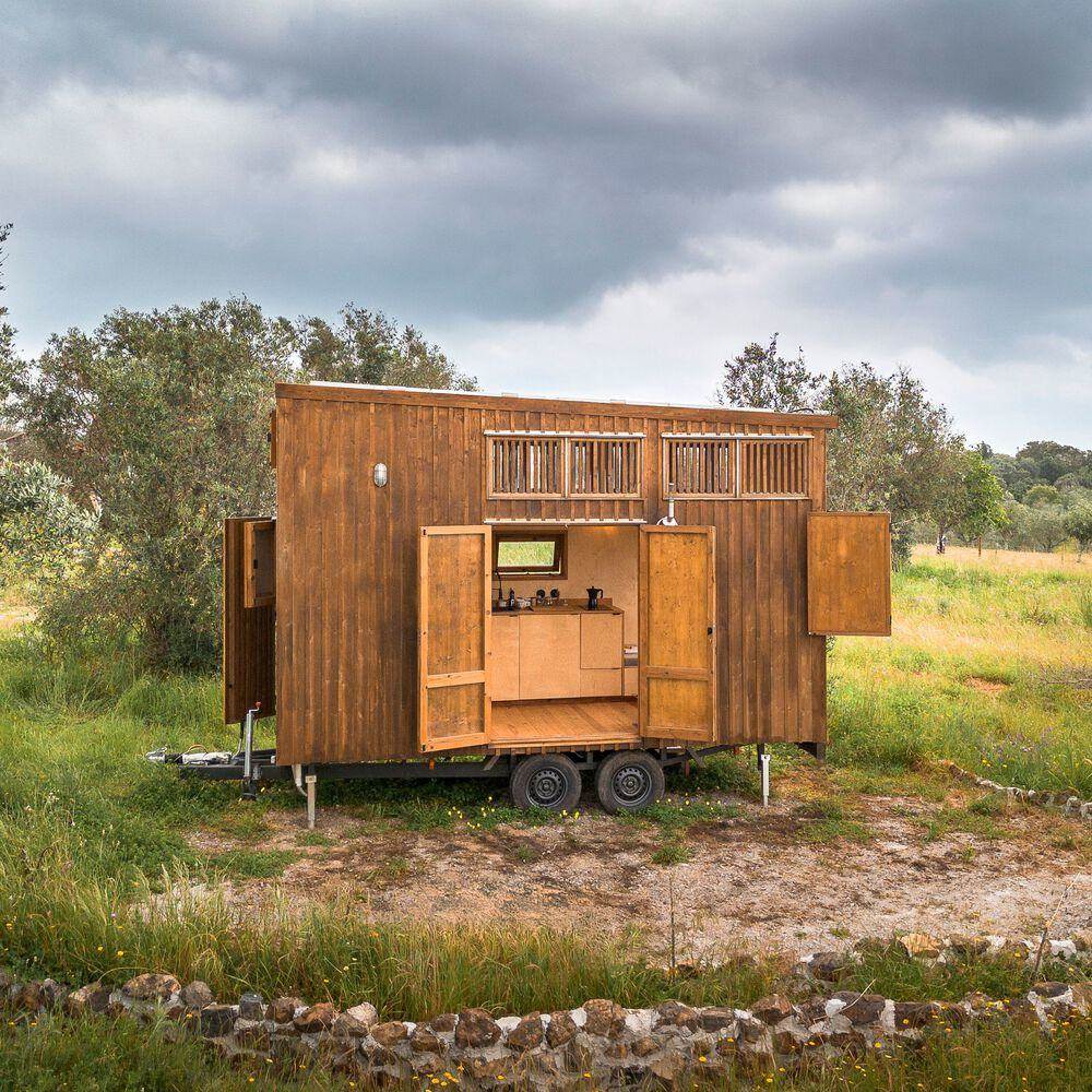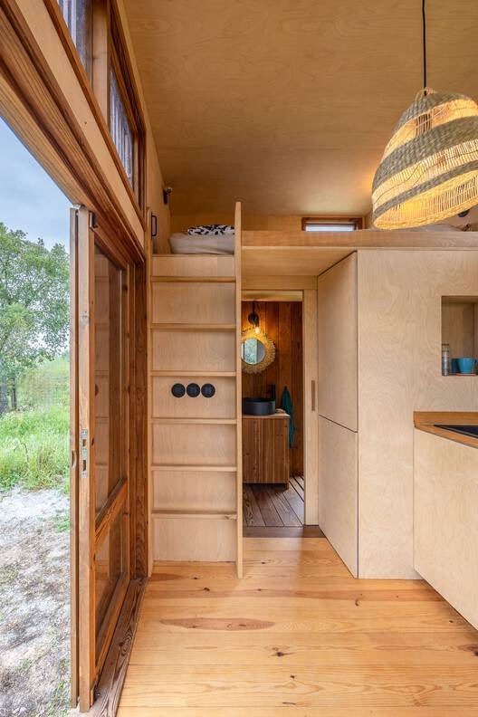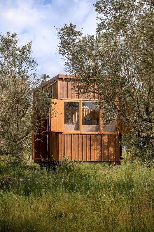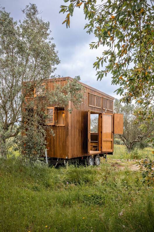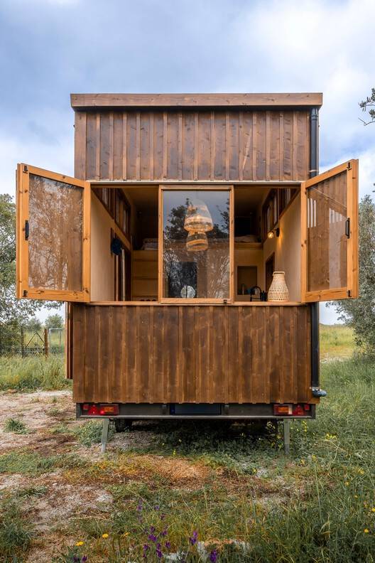 Text description provided by the architects. This tiny house on wheels, designed for two artists, is nestled in the countryside of Alentejo. The house features an upper sleeping loft situated above a well-appointed bathroom, which includes a unique large door in the shower, allowing the experience of showering as if in the open air.