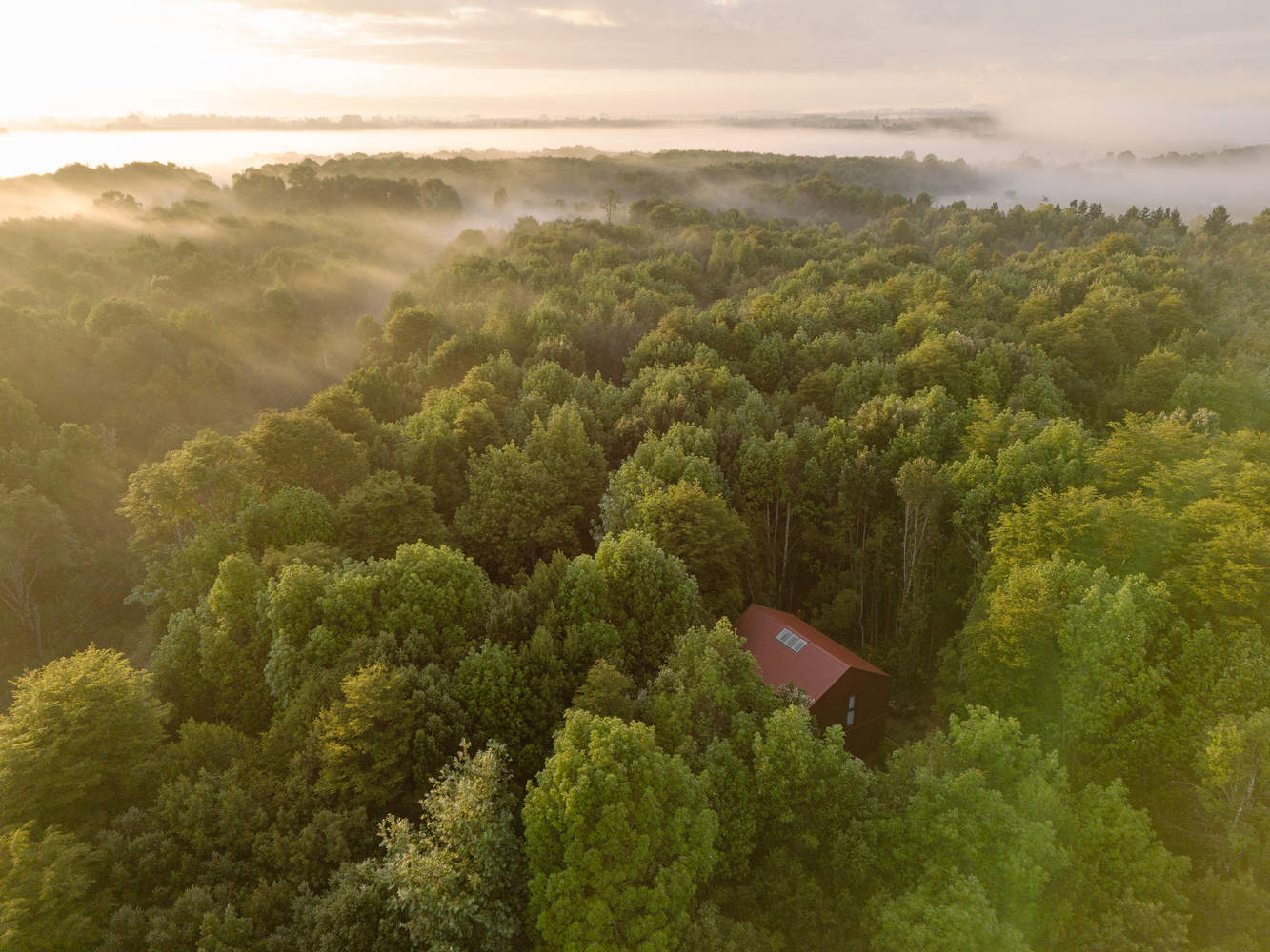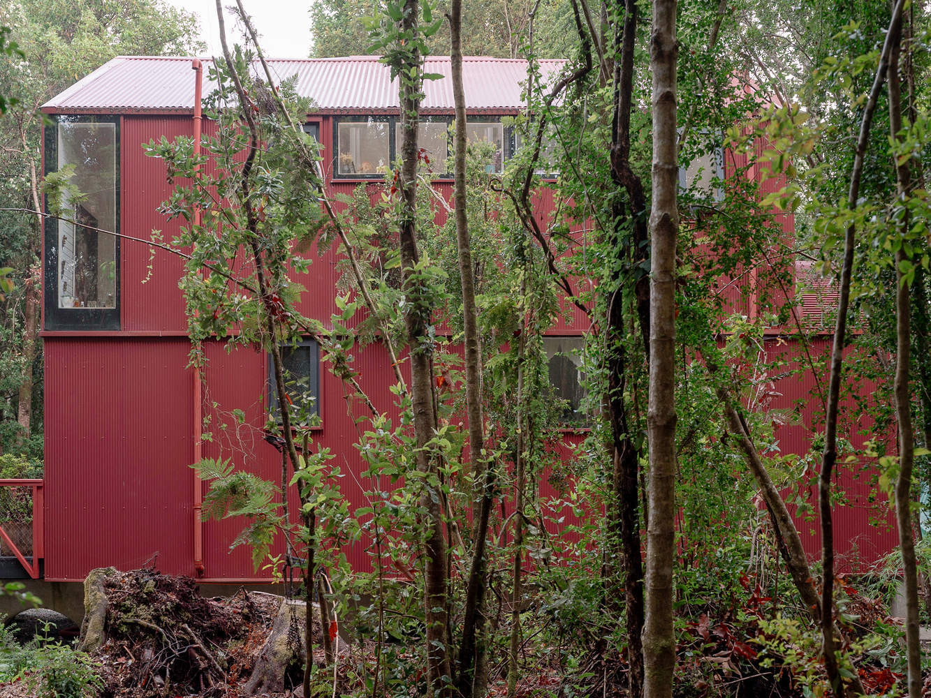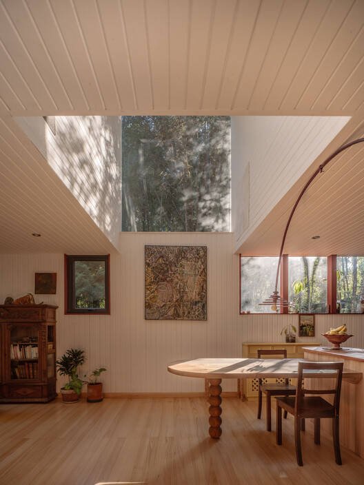 The house's common areas are situated on the first level. Openings are kept minimal, reinforcing the sense of shelter and maintaining the filtered light characteristic of the forest. The second level houses two bedrooms and a bathroom, separated by a central void that acts as the heart of the project.
