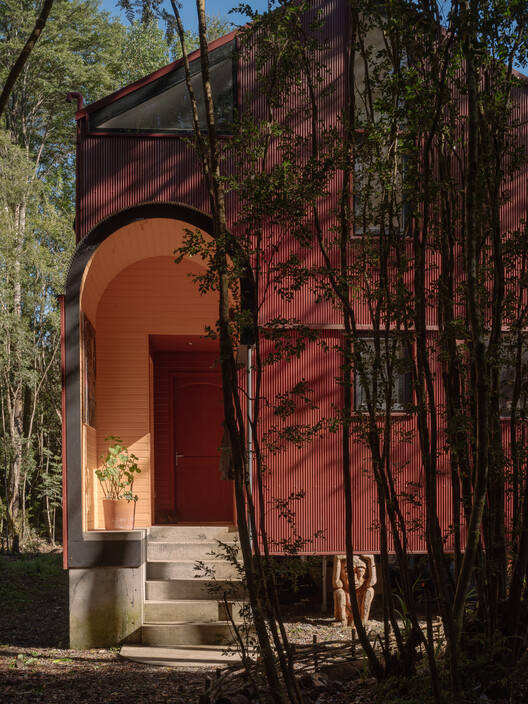Text description provided by the architects. Located within a dense forest in southern Chile, near Puerto Varas, this residential project takes shape as a compact volume elevated on arched foundations that help minimize contact with the ground while emphasizing the intersection between two dissimilar horizontal planes.
