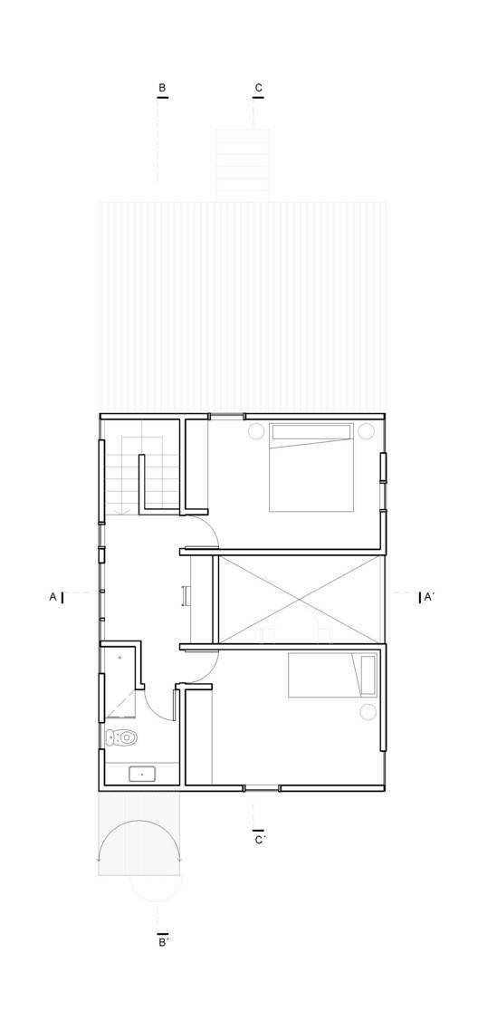 房子的公共区域位于第一层。开口保持最小,增强了庇护感,并保持了森林的过滤光特性。第二层有两间卧室和一间浴室,中间有一个空隙,是项目的核心。