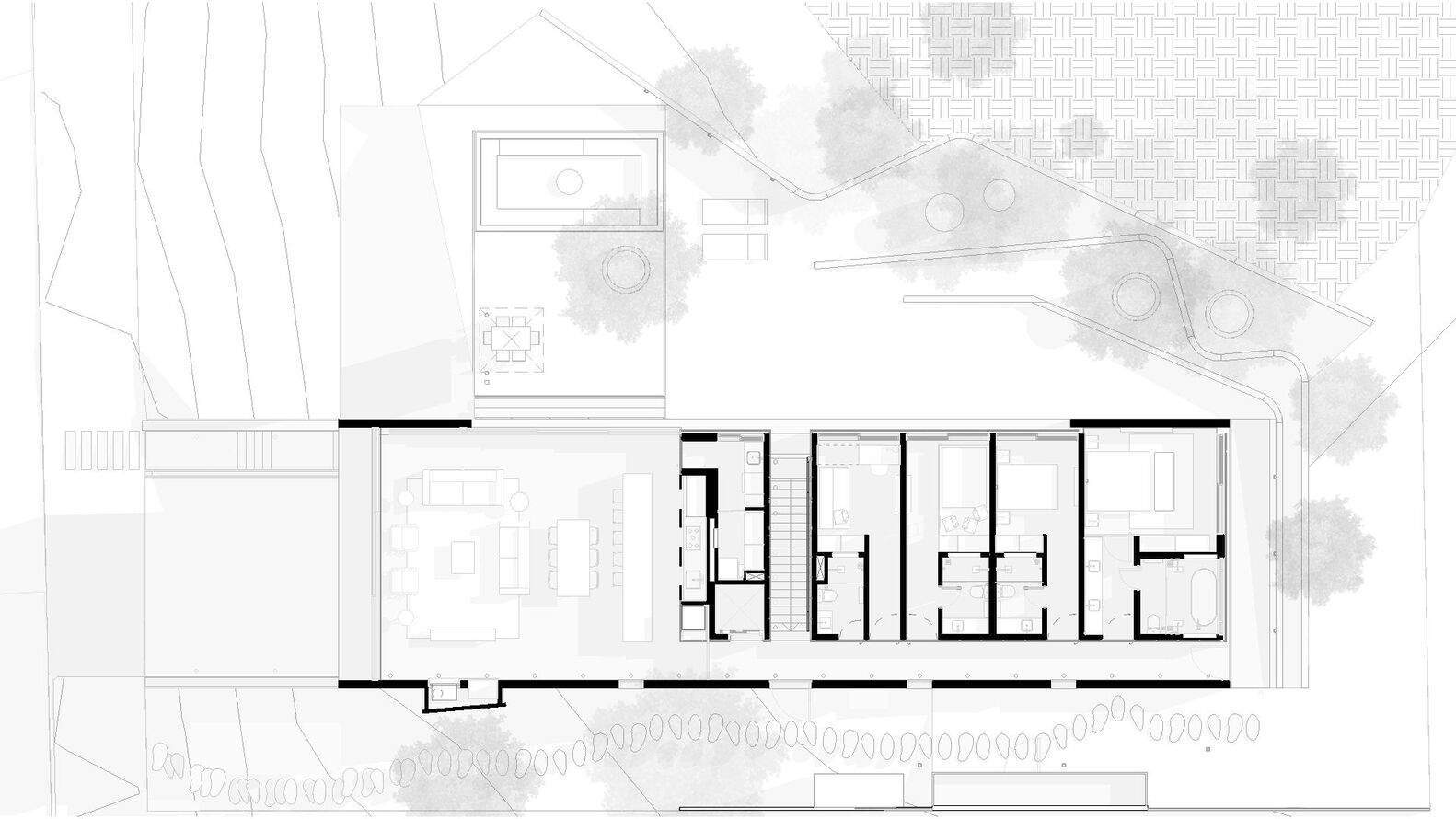 从这种垂直布局来看,建筑与南侧的退缩对齐,在现有的南洋杉树荫下形成了一个面向北方的大型户外休闲区。房子的前面是社交区,后面是卧室,所有卧室都可以直接通往露台。