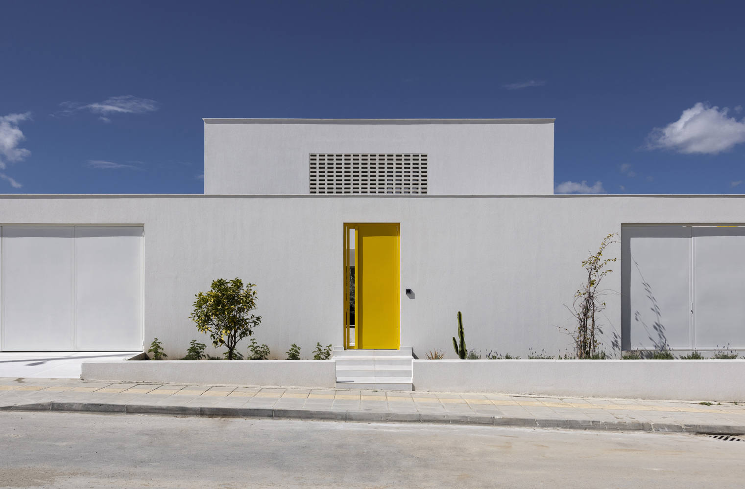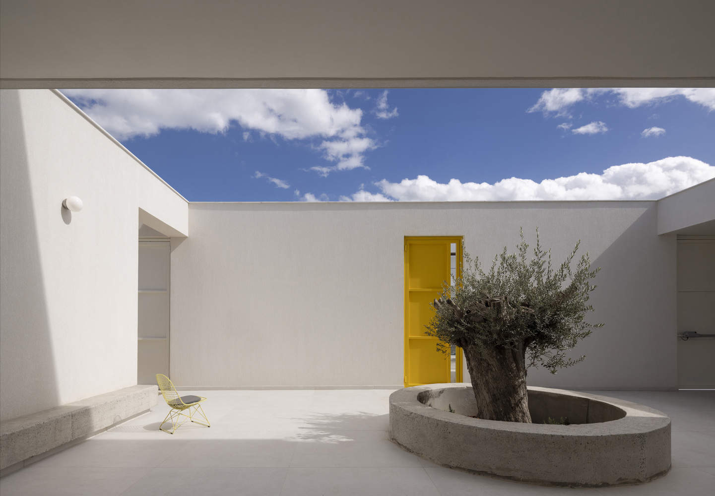 这面3.5米高的垂直墙距离街道3米,占据了整个地块的宽度。它作为一个严格而僵化的边界,拥抱棱镜,反对不连续和嘈杂的城市社区。墙上的三个开口控制着房子的视野。在墙的后面,有一个隐藏的中央广场。这是一个欢迎客人和居民的内院,向社会生活开放。在广场的中心,一棵橄榄树从村里移植过来,唤起了人们对亲人的回忆。