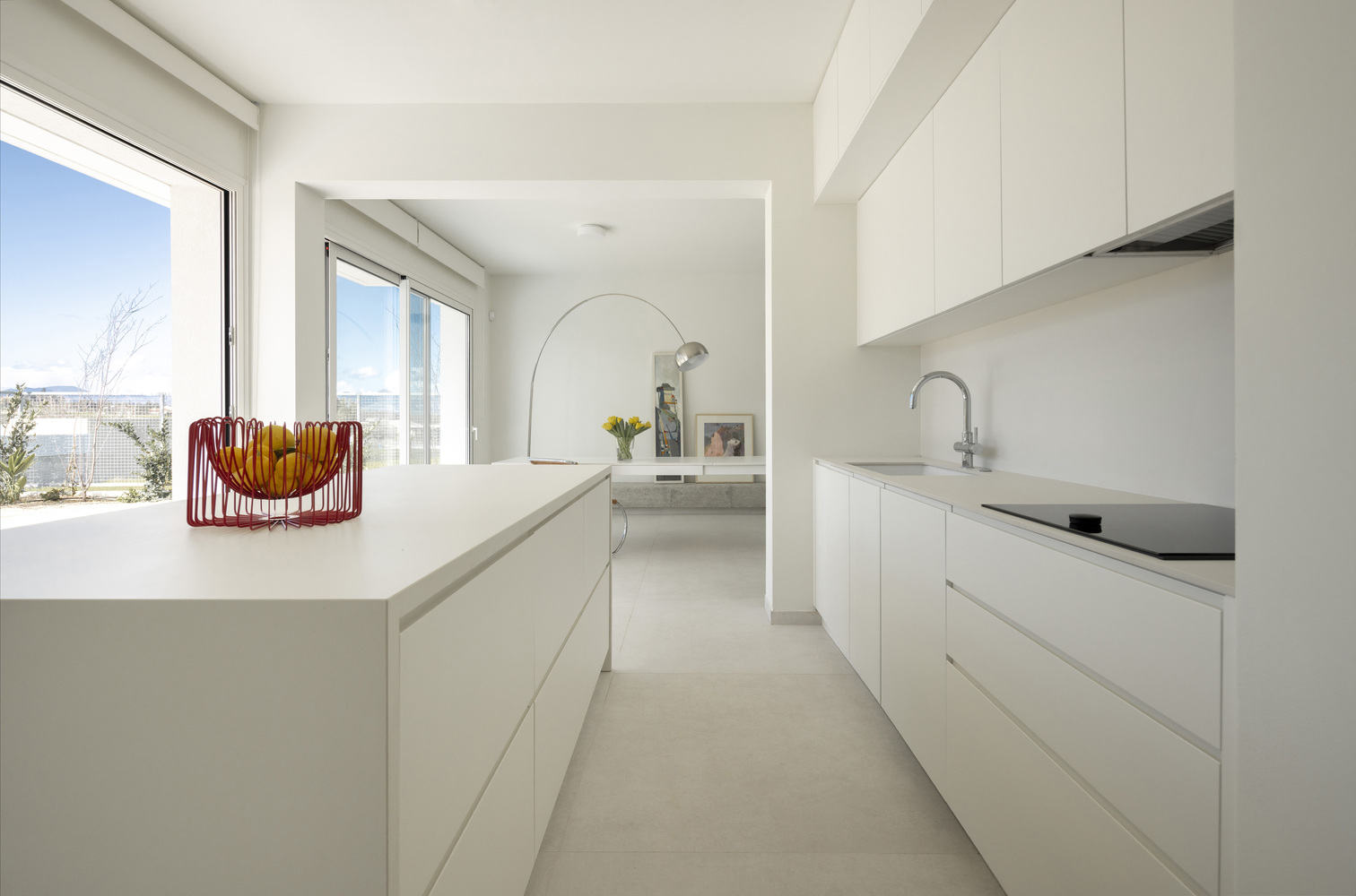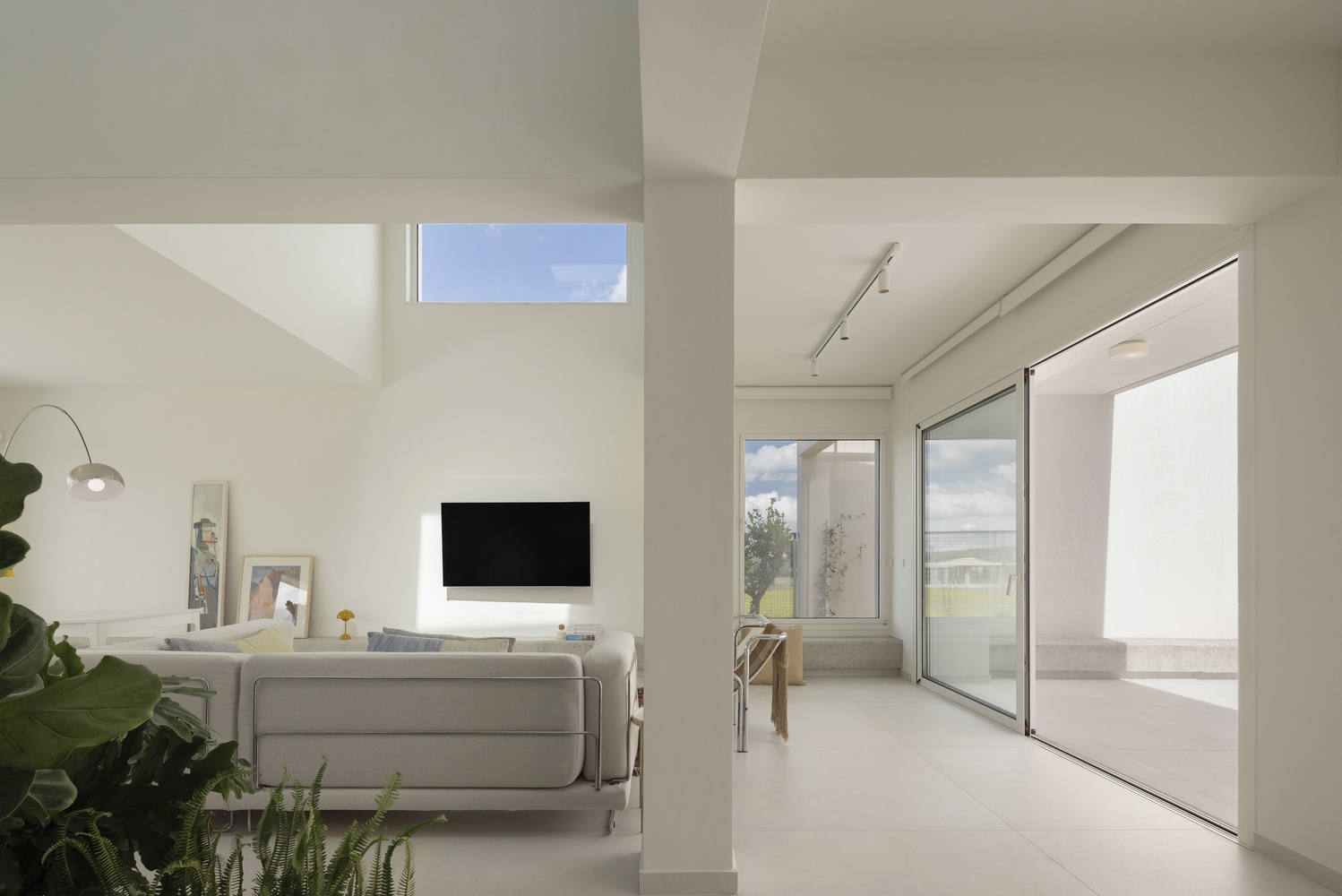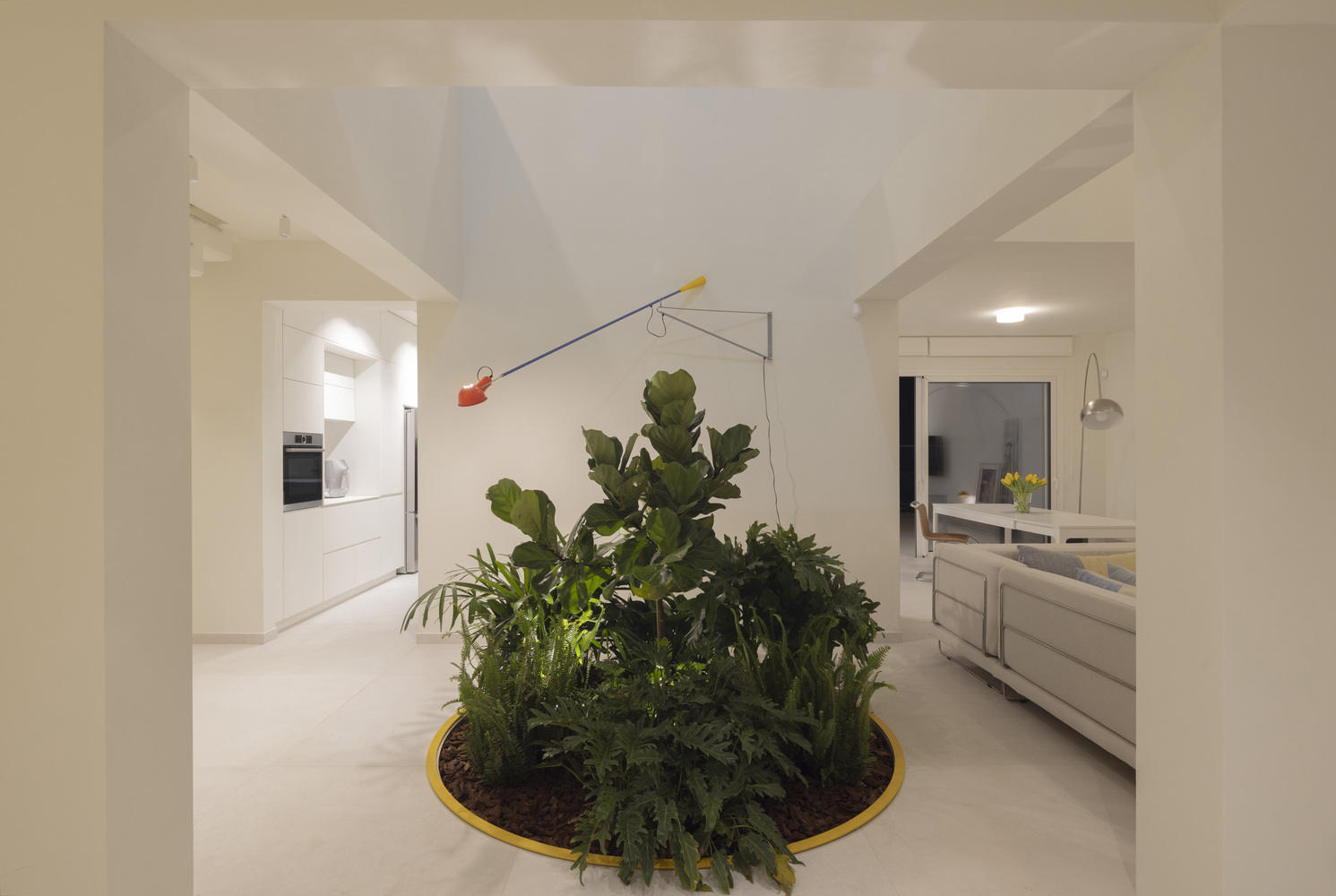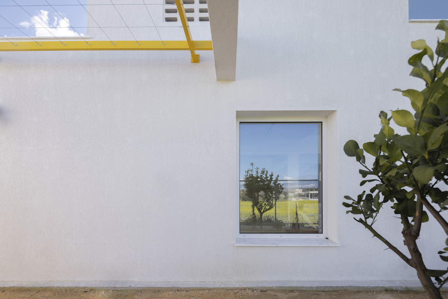 The vertical wall, 3.5 meters high, is placed at a distance of 3 meters from the street occupying the entire width of the plot. It operates as a strict and rigid boundary that embraces the prism and opposes the discontinuous and noisy urban neighborhood. Three openings on the surface of the wall control the views enjoyed by the house. Behind the wall, there is a hidden central square. This is an inner courtyard that welcomes guests and dwellers, opening up to social life. In the center of the square, an olive tree has been transplanted from the village, raising memories of loved ones.