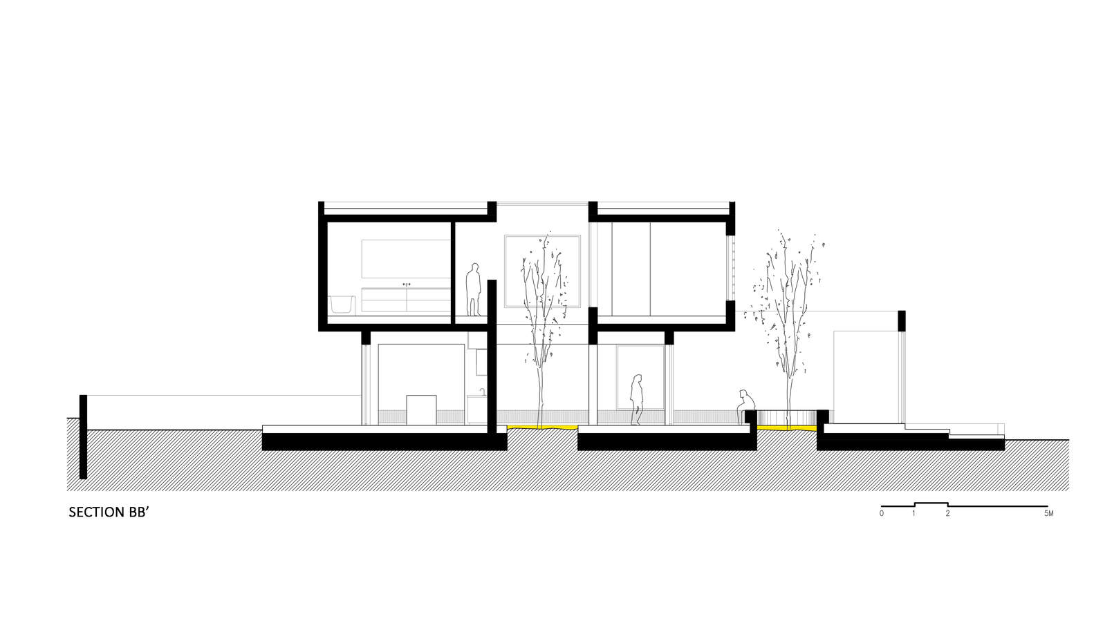 该提案由两个主要部分组成:一个矩形棱柱和一个围绕并包围棱柱的垂直墙。平面为12X10米的棱镜,相对于垂直和水平轴进行了精心雕刻。通过从其实体中移除碎片,出现了一个空白空间,房屋的功能单元围绕着这个空白空间排列。就像一张三维画布,这个空白引入了房屋内水平景观和自然碎片的意想不到的景色。它从上方收集自然光,提供交叉通风,并突破房屋公共和私人空间的限制。从功能上讲,住宅是在两个层面上开发的。一楼设有客厅、厨房和小客房。一楼包括两间带共用浴室的独立卧室和一间带套间的卧室。
