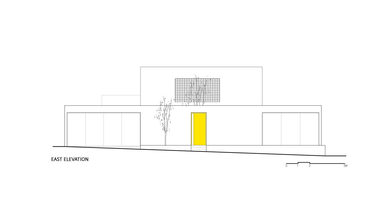 The proposal consists of two main elements: a rectangular prism and a vertical wall that surrounds and embraces the prism. The prism with a plan of 12X10 meters, is elaborately sculpted in relation to the vertical and horizontal axes. By removing pieces from its solid mass, a blank space emerges, around which the functional units of the house are arranged. Like a three-dimensional canvas, the void introduces unexpected views of the horizontal landscape and fragments of nature inside the house. It collects natural light from above, offers cross ventilation and negotiates the limits of the public and private spaces of the house. In functional terms, the residence is developed on two levels. A living room, a kitchen and a small guest room are located on the ground floor. The first floor comprises two individual bedrooms with a shared bathroom and one ensuite bedroom.