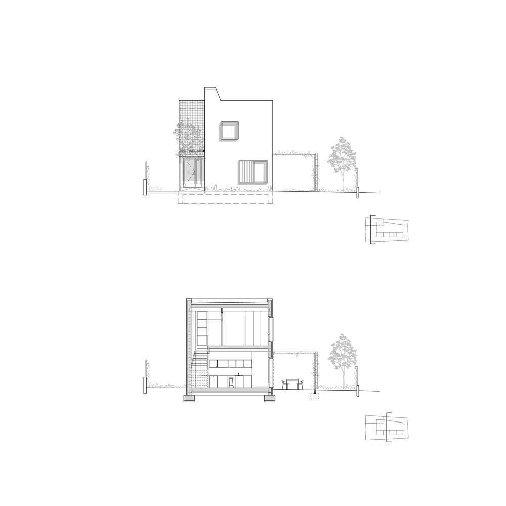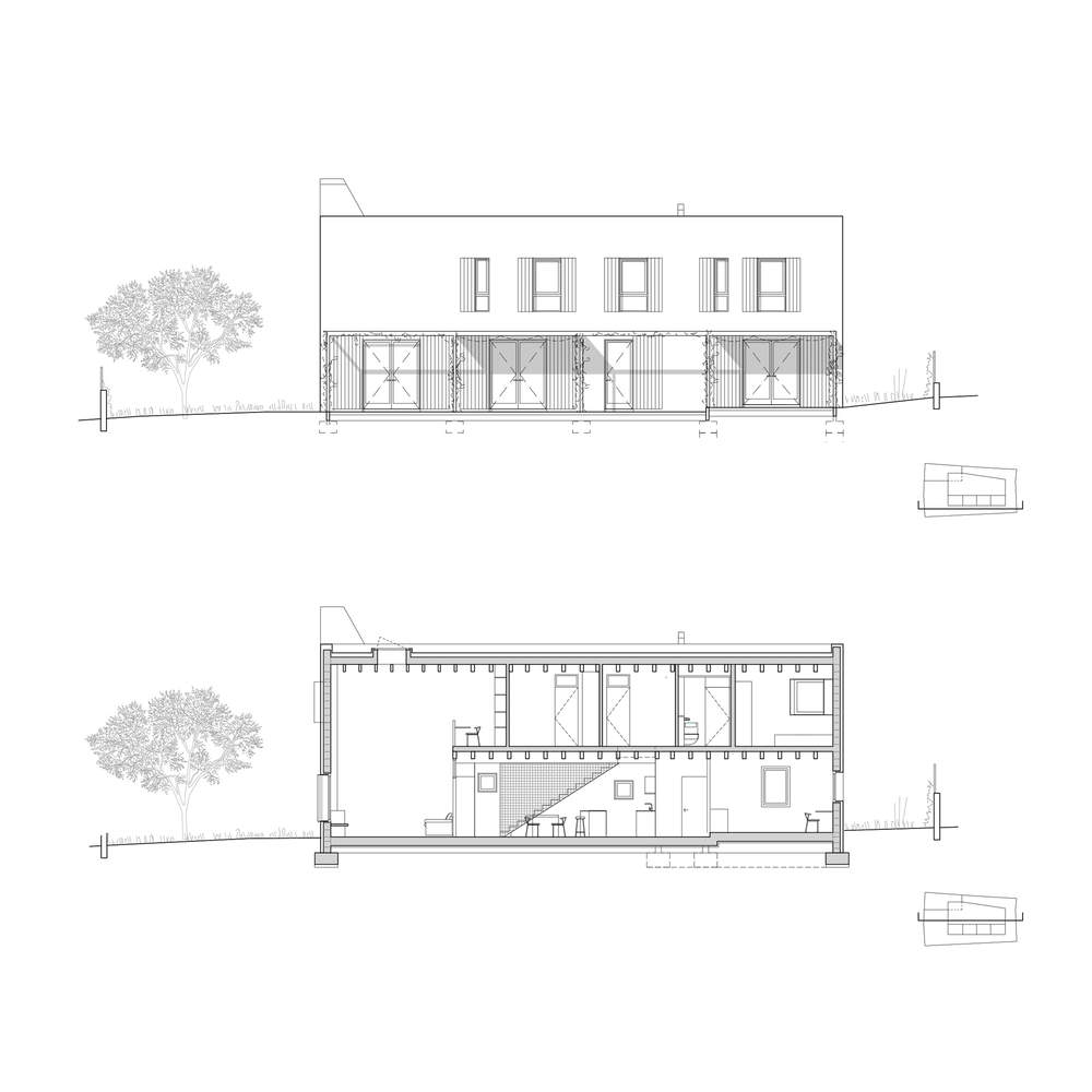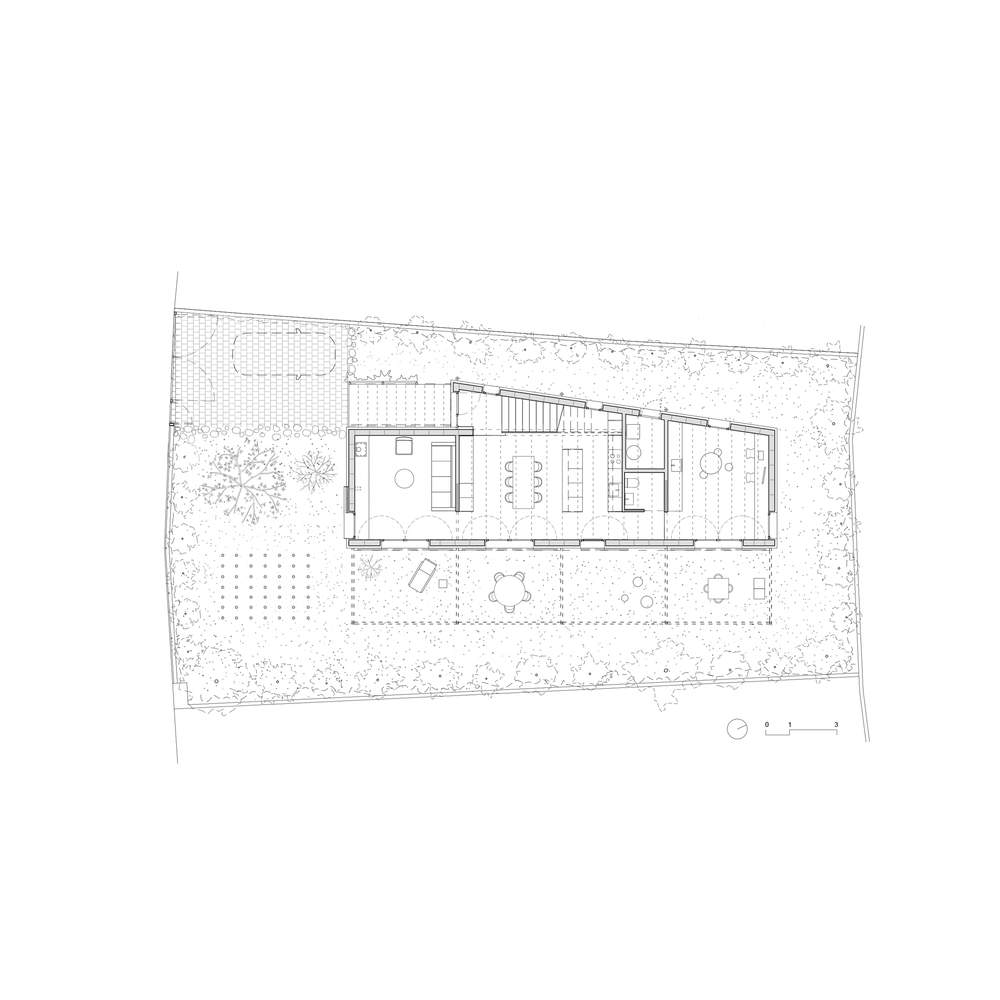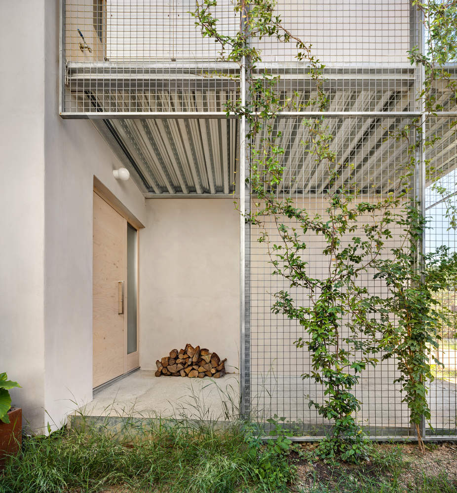 从外面看,由于使用了石灰砂浆和松木等当地材料,这座房子看起来像一个紧凑的体量,与周围的环境融为一体。同时,一系列金属元素创造了两个门廊,定义了房子的主要入口。在东立面上,有一个面向花园的线性门廊,设计为灵活的结构,可以覆盖可适应不同情况的移动遮阳和照明元素。在向西的角落,有一个第二个门廊,它定义了入口,并包括一个金属格栅,可以将视线过滤到位于上层的洗衣区。所有这些金属元素都是为了支持攀爬植物而设计的,随着时间的推移,这些植物将创造出绿色的立面,为最暴露的立面提供太阳能保护,同时让房子与周围的景观融为一体。