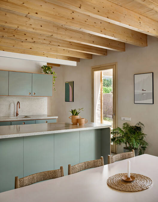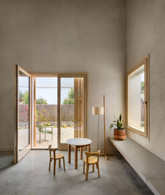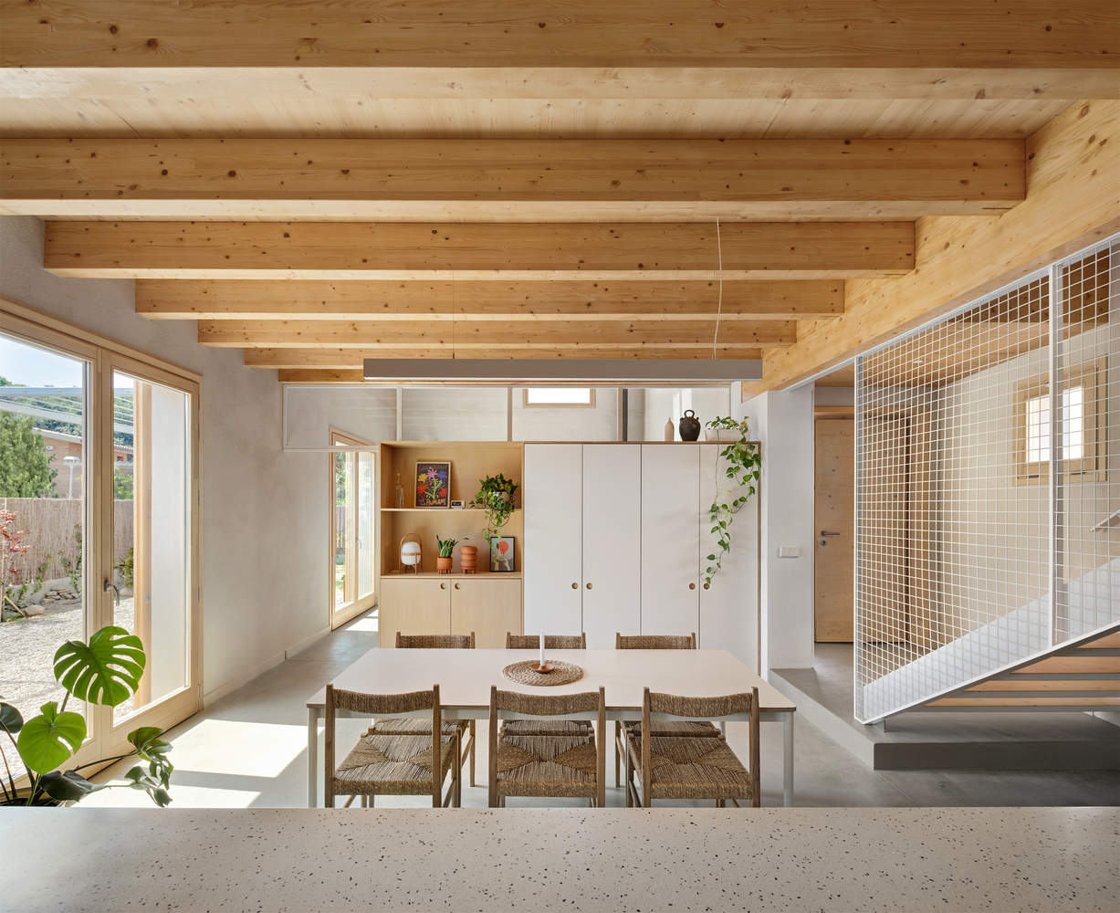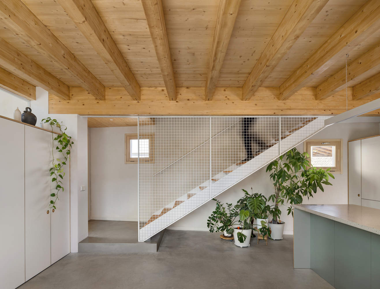 On the outside, the house appears as a compact volume that blends in with its surroundings thanks to the use of local materials such as lime mortar and pine wood. At the same time, a series of metal elements creates two porches that define the main entrances to the house. On the east façade, there is a linear porch facing the garden, designed as a flexible structure that can be covered with mobile shading and lighting elements that can be adapted to different situations. On the west-facing corner, there is a second porch that defines the entrance and includes a metal lattice that filters the views towards the laundry area located on the upper floor. All of these metal elements are also designed to support climbing plants that, over time, will create green facades that will provide solar protection for the most exposed facades and at the same time allow the house to blend in with the surrounding landscape.
