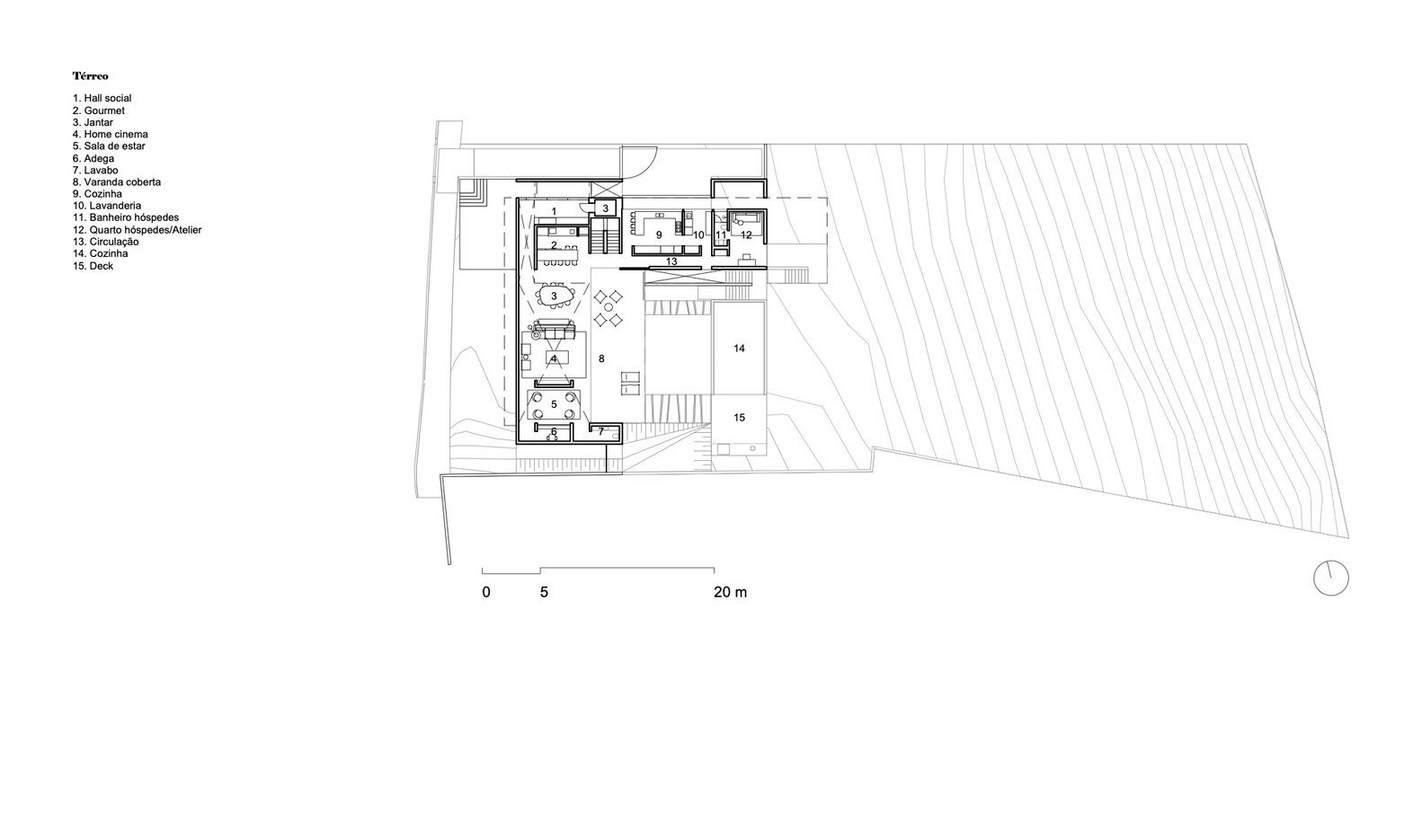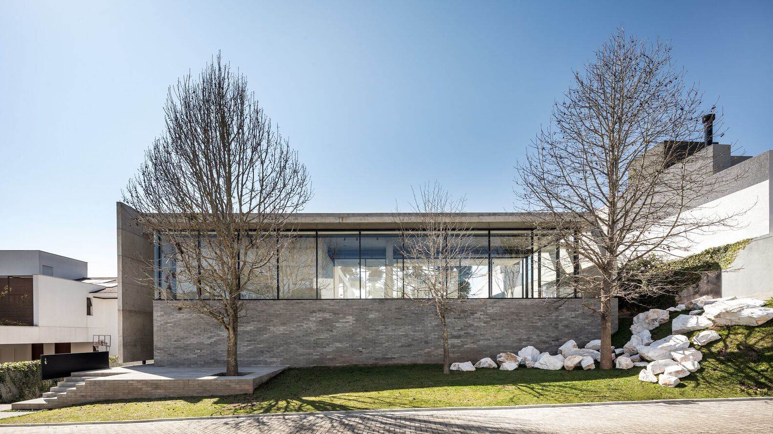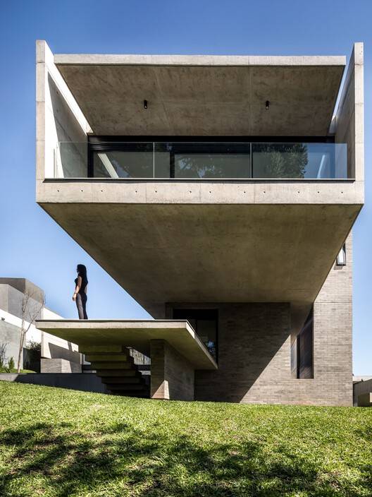 The exposed concrete structure and enclosures are raised off the ground. The walls laid directly on the terrain are covered in gray ceramic bricks, contrasting in texture and volume with the lightness of the exposed concrete elements. The main entrance, featuring an amphitheater-like staircase and plaza, is also finished in the same material. The house number '8' is incorporated into a black metal railing, visible through two circular cutouts. The most striking feature of the landscaping is a cascading arrangement of Paraná white marble blocks, which aids in stabilizing the existing slope.