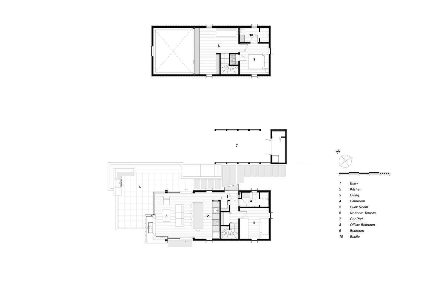 平面布置紧凑,但经过仔细考虑。较低的楼层有一个双层高的起居和厨房空间,通过楼梯与孩子们的浴室和卧室隔开。楼上是一间带套间、办公室和储藏室的双人卧室。巴里说:“内置的存储空间得到了优化,包括鞋架、隐藏的橱柜、楼梯台阶内的抽屉和楼上阁楼的内置货架。”。内部呈现出所要求的日本极简主义外观,黑色配件和细木工制品与木材衬里、雕塑吊扇和齐平橱柜形成对比。紧凑型浴室的湿室风格让人联想到日本水疗中心,地板到天花板,石头般的瓷砖。