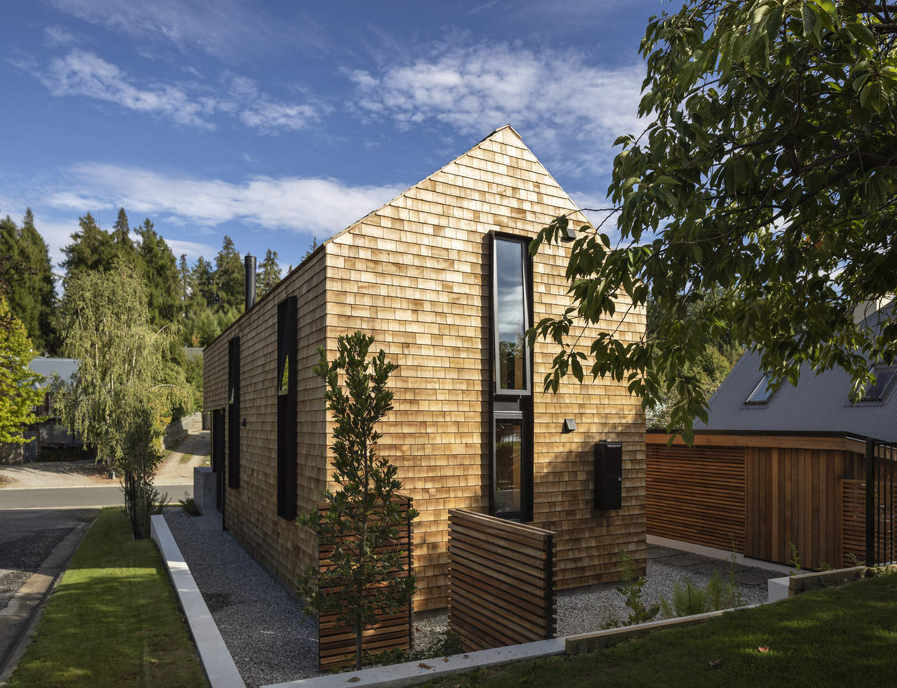 The house also has a strong materiality externally, with a singular cladding and roofing material of warm cedar shingles, which has the added benefit of being low maintenance. As the house faces the street, glazing is restrained and aimed towards views to the west of Mt Roy. The southern facade is free of windows to prevent the gaze of neighbours as they approach from the access way.
