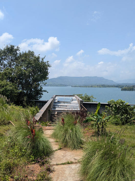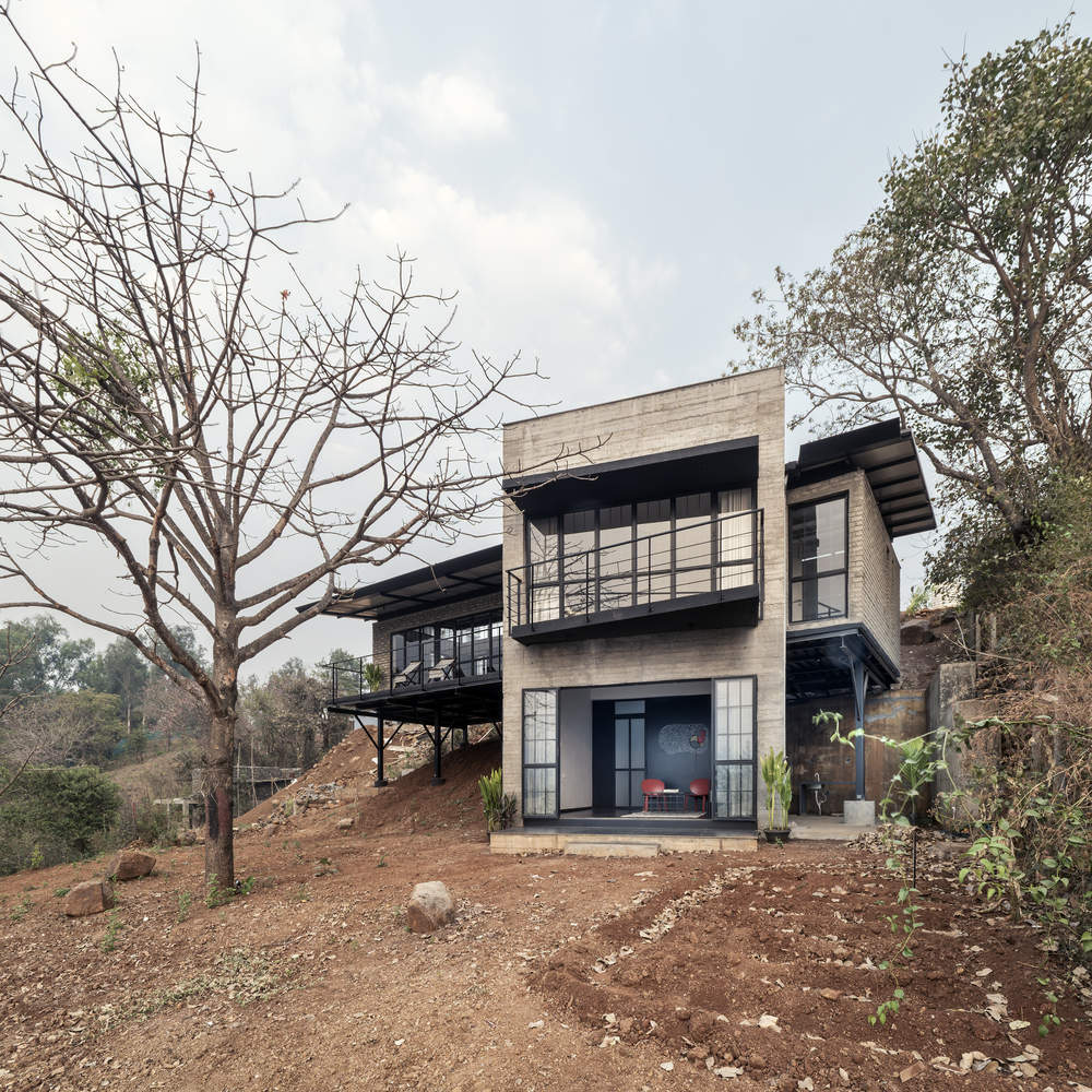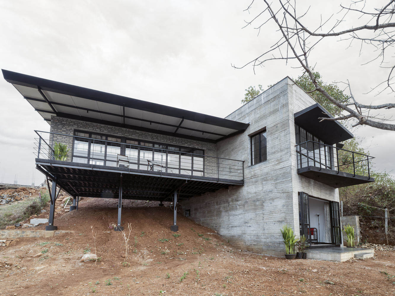 The planning of the house is akin to a simple cruciform plan, where the central arm along the slope is embedded in the ground and the other is stilted and sits lightly on the ground. The central mass; built out of poured stone rubble walls; emerges from the ground taking one gently down the landscaped basalt steps to the red entrance door. It also has a slight tilt in plan, which not only opens up the views of the living room towards the lake but also aligns the bedroom towards the setting sun. The rest of the house is stilted on steel columns, allowing the sloping land underneath to remain undisturbed. Walls of exposed fly ash masonry envelop this block with openings that are strategically placed to capture the picturesque hillsides around the lake.