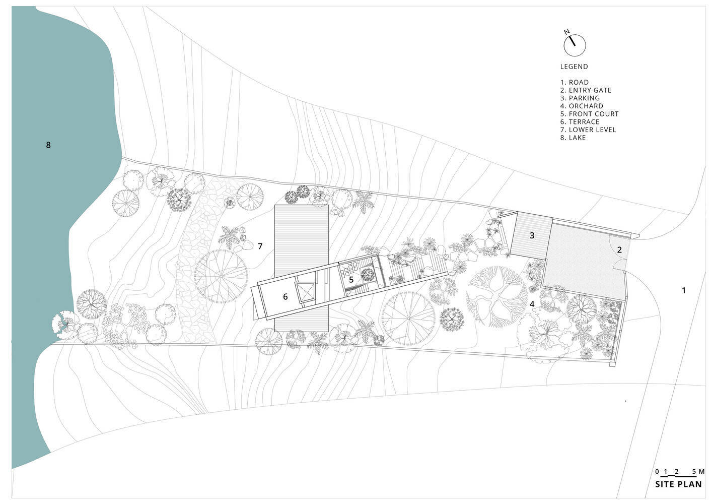 With the recent increase in second-home tourism, the studio wished to create a positive environmental impact by minimizing ground impact and maximizing site potential while lowering the energy value of the built mass using contextually appropriate technologies & materials. The site had an interesting topography, starting with a flat patch upfront which starts steadily sloping down eventually reaching the edge of the lake. Going against the conventional practice, the studio proposed to reserve the flat part for the orchard the client wished for, set the house on the sloping part of the site, and use the natural topography to tuck away the majority of the house from the view at the entrance.