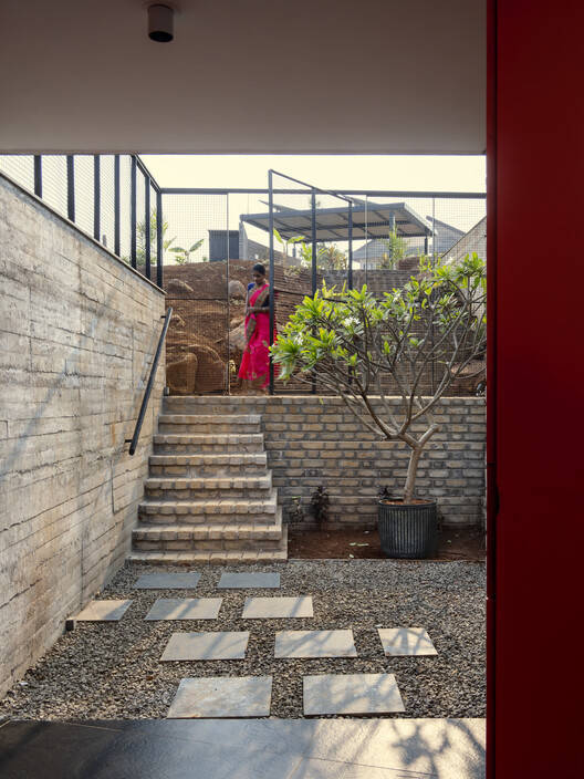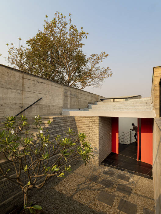 The landscape has mindfully been kept very raw, choosing hardy native trees and wild grass as compared to more manicured options. The studio hopes that with time the vegetation takes over the bare built mass, architecture slowly recedes back and lets nature itself receive all the attention.