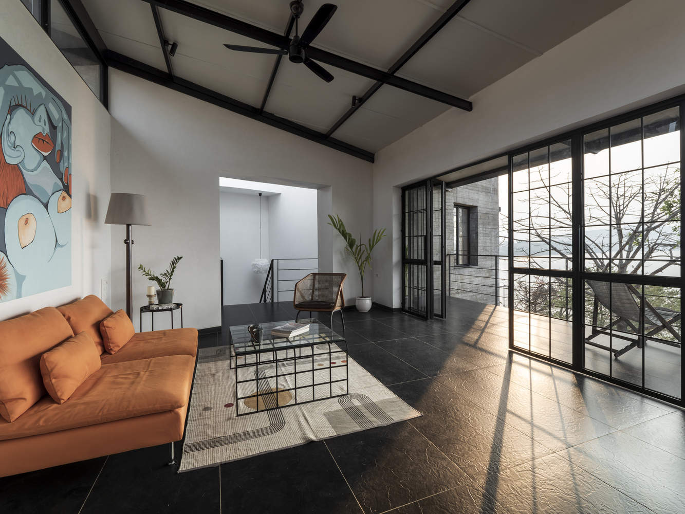 与相当坚硬和裸露的外观相反,房子的内部是一个受欢迎的对比。内部采用天然石灰抹灰,在炎热的夏天保持内部凉爽,石膏的透气性确保水分不会留在墙上。房子中央的天窗将楼梯间沐浴在自然阳光下。由工作室自己制造的定制金属法式门完全打开,将空间与室外连接起来。白色的墙壁和黑色的地板为家具和艺术品中出现的色彩提供了一个中性的背景——所有这些都是客户自己完成的!